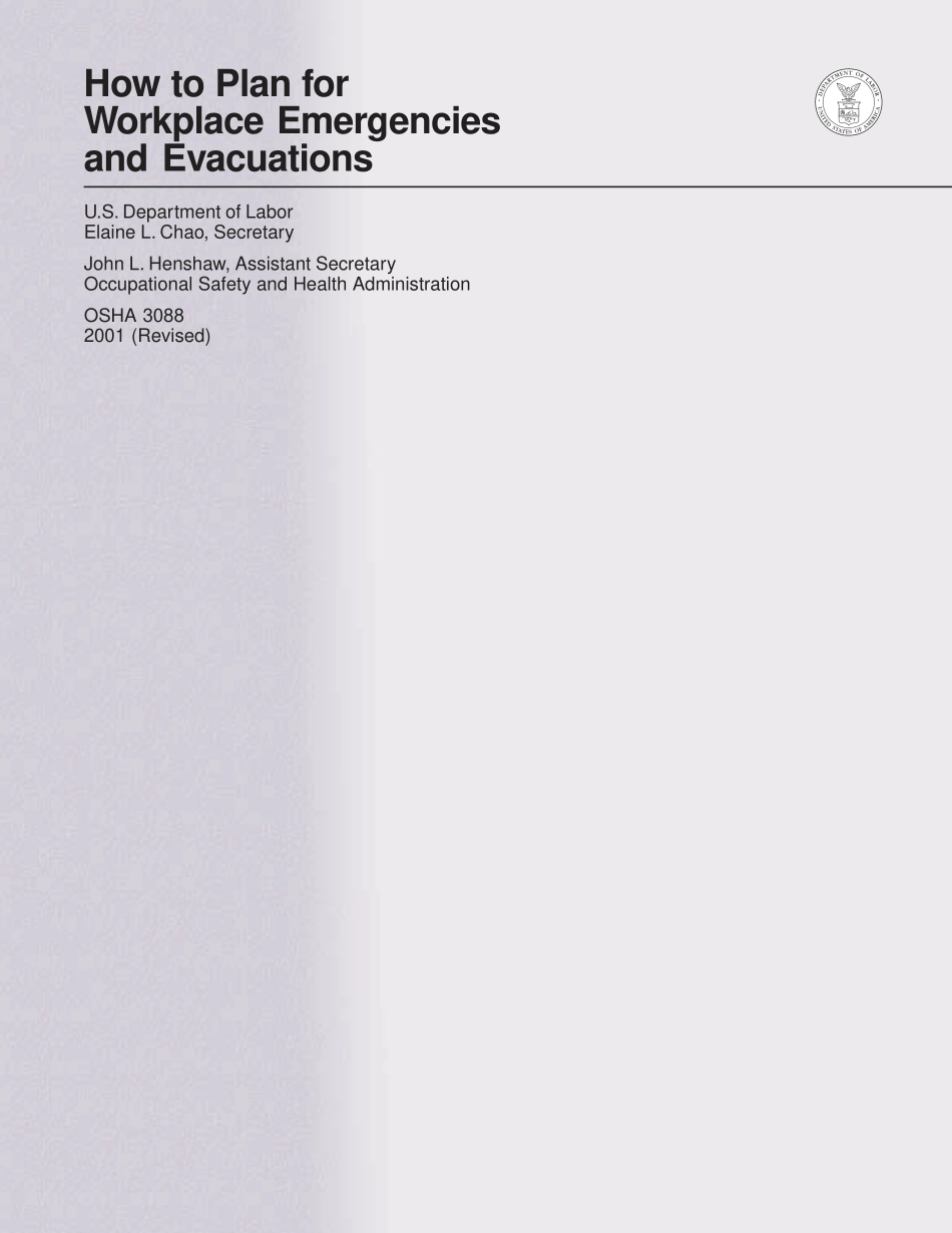 HowtoPlanforWorkplaceEmergenciesandEvacuationsU.S.DepartmentofLaborOccupationalSafetyandHealthAdministrationOSHA30882001(Revised)Thisbookletprovidesagenericoverviewofastandards-relatedtopic.Thispublicationdoesnotalterordeterminecomplianceresponsibilities,whicharedescribedintheOSHAstandardsandtheOccupationalSafetyandHealthAct.Becauseinterpretationsandenforcementpolicymaychangeovertime,thebestsourcesforadditionalguidanceonOSHAcompliancerequirementsarecurrentadministrativeinterpretationsanddecisionsbytheOccupationalSafetyandHealthReviewCommissionandthecourts.Thispublicationisinthepublicdomainandmaybereproducedfullyorpartiallywithoutpermission.Sourcecreditisrequestedbutnotrequired.OSHAwillmakethisinformationavailabletosensoryimpairedindividualsuponrequest.Call(202)693-1999.HowtoPlanforWorkplaceEmergenciesandEvacuationsU.S.DepartmentofLaborElaineL.Chao,SecretaryJohnL.Henshaw,AssistantSecretaryOccupationalSafetyandHealthAdministrationOSHA30882001(Revised)Introduction..........................................................................................................1Whatisaworkplaceemergency?................................................................................1Howdoyouprotectyourself,youremployees,andyourbusiness?.....................................1Whatisanemergencyactionplan?.............................................................................1Whatshouldyouremergencyactionplaninclude?...........................................................2Howdoyoualertemployeestoanemergency?.............................................................3Howdoyoudevelopanevacuationpolicyandprocedures?..............................................3Underwhatconditionsshouldyoucallforanevacuation?..................................................4Whatistheroleofcoordinatorsandevacuationwardensduringanemergency?........................4Howdoyouestablishevacuationroutesandexits?..........................................................5Howdoyouaccountforemployeesafteranevacuation?...................................................5Howshouldyouplanforrescueoperations?.................................................................6Whatmedicalassistanceshouldyouprovideduringanemergency?.......................................6Whatroleshouldemployeesplayinyouremergencyactionplan?........................................6Whatemployeeinformationshouldyourplaninclude?......................................................7Whattypeoftrainingdoyouremployeesneed?.............................................................7Howoftendoyouneedtotrainyouremployees?..........................................................8Whatdoesyourplanneedtoincludeabouthazardoussubstances?......................................8Whatspecialequipmentshouldyouprovideforemergencies?.............................................9Howdoyouchooseappropriaterespiratorsandotherequipment?.......................................9Whoshouldyoucoordinatewithwhendraftingyouremergencyactionplan?..........................9WhatareOSHA’srequirementsforemergencies?.........................................................10WhatotherOSHAstandardsaddressemergencyplanningrequirements?.............................11WhatassistancedoesOSHAprovide?......................................................................12Whateducat...