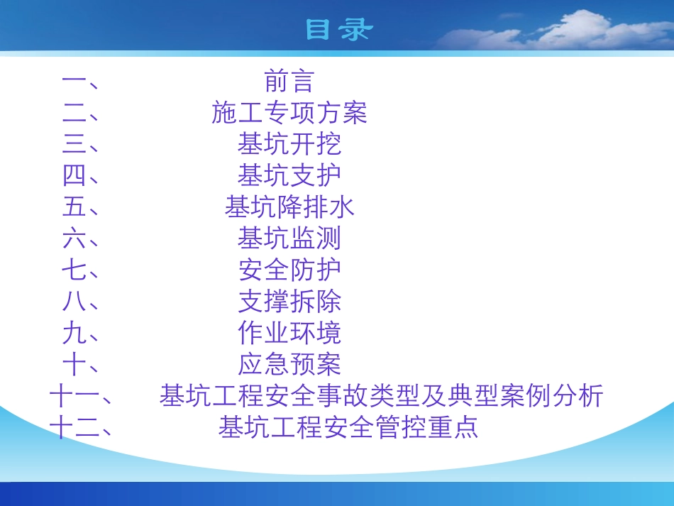 基坑工程安全培训目录一、前言二、施工专项方案三、基坑开挖四、基坑支护五、基坑降排水六、基坑监测七、安全防护八、支撑拆除九、作业环境十、应急预案十一、基坑工程安全事故类型及典型案例分析十二、基坑工程安全管控重点一前言前言基坑工程是为保护基坑施工、地下结构的安全和周边环境不受损害而采取的支护、基坑土体加固、地下水控制、开挖等工程的总称,包括勘察、设计、施工、监测、试验等。对于基坑工程的安全管理,主要涉及专项方案的编制与审核、基坑开挖、基坑支护及降水、基坑监测、安全防护等方面内容。参考资料:《建筑施工安全检查标准》JGJ59-2011,并结合《建筑施工土石方工程安全技术规范》JGJ180-2009,《建筑基坑工程检测技术规范》GB50497-2009,《建筑基坑支护技术规范》JGJ120-2012,《危险性较大的分部分项工程安全管理办法》〔2009〕87号部令等相应规范。二施工专项方案根据住建部《危险性较大的分部分项工程安全管理办法》〔2009〕87号令:1、基坑工程施工应编制专项施工方案,开挖深度超过3m或虽未超过3m但地质条件和周边环境复杂的基坑土方开挖、支护、降水工程,应单独编制专项施工方案。2、专项方案应当由施工单位技术部门组织本单位施工技术、安全、质量等部门的专业技术人员进行审核。经审核合格的,由施工单位技术负责人签字。实行施工总承包的,专项方案应由总承包单位技术负责人及相关专业承包单位技术负责人签字。不需专家论证的专项方案,经施工单位审核合格后报监理单位,由项目总监理工程师审核签字。3、开挖深度超过5m的基坑土方开挖、支护、降水工程或开挖深度虽未超过5m但地质条件、周围环境复杂的基坑土方开挖、支护、降水工程专项施工方案,应组织专家进行论证。二、施工方案4、施工单位应当严格按照专项施工方案组织施工,不得擅自修改、调整方案。如因设计、结构、外部环境等因素发生变化确需修改的,修改后的专项施工方案应当重新审核。对于超过一定规模的危险性较大工程的专项方案,施工单位应当重新组织专家进行论证。二、施工方案危险性较大分部分项工程范围:一、基坑支护、降水工程开挖深度超过3m(含3m)或虽未超过3m但地质条件和周边环境复杂的基坑(槽)支护、降水工程。二、土方开挖工程开挖深度超过3m(含3m)的基坑(槽)的土方开挖工程。超过一定规模的危险性较大分部分项工程范围:一、深基坑工程(一)开挖深度超过5m(含5m)的基坑(槽)的土方开挖、支护、降水工程。(二)开挖深度虽未超过5m,但地质条件、周围环境和地下管线复杂,或影响毗邻建筑(构筑)物安全的基坑(槽)的土方开挖、支护、降水工程二、施工方案三基坑开挖三、基坑开挖根据JGJ180-2009《建筑施工土石方工程安全技术规范》与JGJ120-2012《建筑基坑支护技术规程》1、基坑开挖应遵循“开槽支撑,先撑后挖,分层开挖,严禁超挖”原则。2、当基坑开挖面上方的锚杆、土钉、支撑未达到设计要求时,严禁向下超挖土方。采用锚杆或支撑的支护结构,在未达到设计规定的拆除条件时,严禁拆除锚杆或支撑。基坑周边施工材料、设施或车辆荷载严禁超过设计要求的地面荷载限值。(强制性条文)3、应按支护结构设计规定的施工顺序和开挖深度分层开挖。4、对于软土基坑,应按分层、分段、对称、均衡、适时的原则开挖,层高不宜超过1m。5、开挖时,挖土机械不得碰撞或损害锚杆、腰梁、土钉墙墙面、内支撑及其连接件等构件,不得损害已施工的基础桩。6、当基坑采用降水时,地下水位以下的土方应在降水后开挖。三、基坑开挖四基坑支护基坑土方开挖的施工工艺一般有两种:放坡开挖(无支护开挖)和在支护体系保护下外挖(有支护开挖)。对于基坑不太深且基坑平面之外有足够的空间可以放坡的,我们一般采用放坡开挖,这样既简单又经济。对于深基坑或地质条件和周边环境复杂的基坑(槽),就要采取支护体系。基坑支护结构设计的原则为:(1)安全可靠(2)经济合理(3)便利施工四、基坑支护根据JGJ120-2012《建筑基坑支护技术规程》基坑支护设计时,应综合考虑基坑周边环境和地质条件的复杂程度、基坑深度等因素。对同一基坑的不同部位,可采用不同的安全等级。四、基坑支护深层...