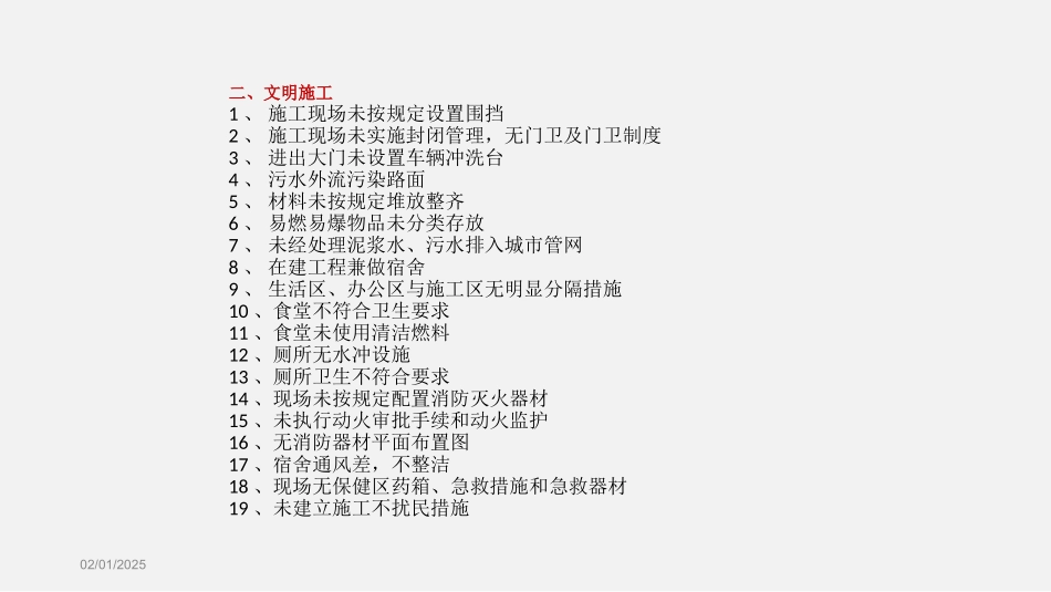 02/01/2025施工现场常见安全隐患汇总200项壹安全管理1、工程项目未办理安全监督登记手续2、未按规定配备专职安全员3、项目经理、安全员无安全生产知识考核合格证4、未制定安全管理目标(伤亡控制指标和安全达标、文明施工目标)5、专业性较强的项目未单独编制专项施工方案6、专项方案(安全措施)针对性不强7、专项方案(安全措施)未落实8、无书面安全技术交底9、安全技术交底针对性不强10、安全技术交底未履行签字手续11、无定期安全检查记录12、检查出事故隐患未按规定整改13、未按规定进行安全教育14、班组安全活动无记录15、特种作业人员无证上岗16、无现场安全标志总平面图17、未按现场安全标志总平面图设置安全标志18、未建立工伤事故档案02/01/2025二、文明施工1、施工现场未按规定设置围挡2、施工现场未实施封闭管理,无门卫及门卫制度3、进出大门未设置车辆冲洗台4、污水外流污染路面5、材料未按规定堆放整齐6、易燃易爆物品未分类存放7、未经处理泥浆水、污水排入城市管网8、在建工程兼做宿舍9、生活区、办公区与施工区无明显分隔措施10、食堂不符合卫生要求11、食堂未使用清洁燃料12、厕所无水冲设施13、厕所卫生不符合要求14、现场未按规定配置消防灭火器材15、未执行动火审批手续和动火监护16、无消防器材平面布置图17、宿舍通风差,不整洁18、现场无保健区药箱、急救措施和急救器材19、未建立施工不扰民措施02/01/2025三、脚手架1、脚手架高度超过规范规定无设计计算书2、脚手架施工方案未经审核批准3、脚手架施工方案不具体、不能指导施工4、脚手架立杆少底座5、脚手架无扫地杆6、架体与建筑物少拉结7、未按规定设置剪刀撑8、脚手架未按规定设置密目式安全网9、施工层未设1.2m高防护栏杆10、施工层未设18cm高挡脚板11、脚手架搭设未按规定办理验收手续12、施工层脚手架内立杆与建筑物之间未进行封闭13、架体未设上下通道14、卸料平台未经设计计算15、悬挑式钢平台安装不符合设计要求16、落地式卸料平台支撑系统与脚手架连结17、卸料平台无荷载限定标志18、脚手架杆件搭设间距不符合要求02/01/2025四、施工用电1、无临时用电施工组织设计2、临时用电施工组织设计针对性不强3、未达到三级配电、两级保护4、总电源处动力和照明供电未分开5、无总漏电保护装置6、电缆电线随地敷设7、电缆电线未使用绝缘材料固定8、与外电线路安全距离达不到,未按规定采取防护措施9、临时用电由专用电力变压器供电,未采用TN-S保护接零系统10、工作零线和保护零线从总电源处未分开设置11、未按规定选用安全电压12、照明末端各单相回路中未设置漏电保护器13、室内外照明线用花线、塑胶线14、用电设备未设专用开关箱,无专用漏电保护器15、箱体和箱内低压电器选用、安装不当16、分配电箱中一把分闸接两台及两台以上用电设备17、熔断器和熔丝安装、选用不当18、电箱内未设置接零排02/01/2025五、塔式起重机1、塔式起重机未取得机械检测合格证2、塔式起重机未按要求办理使用登记手续3、吊钩无防脱棘爪保险装置4、塔吊高度超过规定不安装附墙装置5、附墙装置安装不符合说明书要求6、未制定塔吊安装拆卸施工方案7、安装单位无安装资质8、安装单位的安装资质不符合要求9、基础无隐蔽工程验收手续10、塔吊与架空线路小于安全距离无防护措施11、两台以上塔吊作业无防碰撞措施12、安装完毕后未按规定进行验收13、安装拆卸塔吊未履行安全技术交底14、验收中无量化验收内容15、架体垂直度超过说明书要求16、电气控制无漏电保护装置17、在避雷保护范围外无避雷装置02/01/2025六、施工电梯1、施工电梯吊笼安全装置不灵敏2、施工电梯门连锁装置不起作用3、地面吊笼出入口无防护棚4、每层卸料口无安全防护门5、每层卸料口安全防护门不使用6、司机无证上岗作业7、超过规定载人、载物8、未加配重载人9、安装拆卸外用电梯无施工方案10、安装、拆卸队伍无资格证书11、安装拆卸外用电梯未履行安全技术交底12、安装完毕后未按规定进行验收13、验收中无量化验收内容14、架体垂直度超过说明书要求15、电气控制无漏电保护装置16、在避雷保护范围外无避雷装置17、外用电梯未经机械检测合格使用18、未按规定要求办...