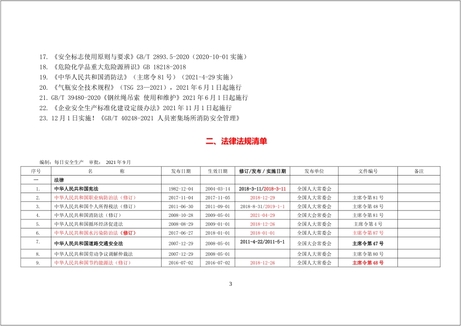 1安全/环境/职业健康法律法规文件清单(2021年12月版)安全/环境/职业健康法律法规文件清单(2021年12月版)一、重点关注法律法规1.应急管理部5号令《高层民用建筑消防安全管理规定》(2021-8-1施行)2.应急管理部6号令《工贸企业粉尘防爆安全规定》(2021-9-1施行)3.新《安全生产法》(2021-9-1正式生效)4.《刑法》修正案(十一)(2021-3-1实施)5.《中华人民共和国民法典》(2021-01-01实施)6.《生产安全事故应急预案管理办法》(2019-09-01实施)7.《生产经营单位生产安全事故应急预案编制导则》(GBT29639-2020)(2021-04-01实施)8.《安全生产法》(2021年修订)(即将修订)9.《中华人民共和国固体废物污染环境防治法》(2020-09-01实施)10.《危险废物名录(2021年版)》(2021-01-01实施)11.《建设工程消防设计审查验收管理暂行规定》(2020-06-01实施)12.《社会单位灭火和应急疏散预案编制及实施导则》GB/T38315-2019(2021-04-01实施)13.《生产安全事故应急条例》(2019-04-01实施)14.《易制爆危险化学品治安管理办法》(2019-08-10实施)15.《全国安全生产专项整治三年行动计划》16.《头部防护安全帽》GB2811-2019(2020-07-01实施)217.《安全标志使用原则与要求》GB/T2893.5-2020(2020-10-01实施)18.《危险化学品重大危险源辨识》GB18218-201819.《中华人民共和国消防法》(主席令81号)(2021-4-29实施)20.《气瓶安全技术规程》(TSG23—2021),2021年6月1日起施行21.GB/T39480-2020《钢丝绳吊索使用和维护》2021年6月1日起施行22.《企业安全生产标准化建设定级办法》2021年11月1日起施行23.12月1日实施!《GB/T40248-2021人员密集场所消防安全管理》二、法律法规清单编制:每日安全生产审批:2021年9月序号名称发布日期生效日期修订/发布/实施日期发布单位文件编号备注一法律1.中华人民共和国宪法1982-12-042004-03-142018-3-11/2018-3-11全国人大常委会2.中华人民共和国职业病防治法(修订)2017-11-042017-11-052018-12-29全国人大常委会主席令第81号3.中华人民共和国个人所得税法(修订)2011-06-302011-09-012018-8-31/2019-1-1全国人大常委会主席令第48号4.中华人民共和国消防法(修订)2008-10-282009-05-012021-04-29全国大会常委会主席令第81号5.中华人民共和国循环经济促进法2008-08-292009-01-012018-12-26全国人大常委会主席令第4号6.中华人民共和国水污染防治法(修订)2017-06-272018-01-012018-01-01全国人大常委会主席令第87号7.中华人民共和国道路交通安全法2007-12-292008-05-012011-4-22/2011-5-1全国大会常委会主席令第47号8.中华人民共和国劳动争议调解仲裁法2007-12-292008-05-01全国人大常委会主席令第80号9.中华人民共和国节约能源法(修订)2016-07-022016-07-022018-12-26全国人大常委会主席令第48号3序号名称发布日期生效日期修订/发布/实施日期发布单位文件编号备注10.中华人民共和国劳动合同法2007-06-292008-01-012012-12-28/2013-7-1全国人大常委会主席令第21号11.中华人民共和国固体废物污染环境防治法(修订)2016-11-072016-11-072020-04-29/2020-9-01全国人大常委会主席令第58号12.中华人民共和国环境噪声污染防治法1996-10-291997-3-12018-12-29全国人大常委会13.中华人民共和国行政许可法2003-11-242004-07-012019-04-23全国人大常委会主席令第7号14.中华人民共和国公司法1993-12-291993-12-292018-10-26全国人大常委会主席令第20号15.中华人民共和国环境影响评价法2002-10-282003-09-012018-12-29全国人大常委会主席令第77号16.中华人民共和国安全生产法(修订)2014-08-312014-12-012021-6-10/2021-9-1全国大会常委会主席令第88号17.中华人民共和国工会法1992-04-032001-10-272009-08-27全国大会常委会主席令第57号18.中华人民共和国大气污染防治法2015-08-292016-01-012018-12-26全国人大常委会主席令第31号19.中华人民共和国产品质量法2000-07-082000-07-082018-12-29全国人大常委会主席令第33号20.中华人民共和国会计法(修订)2017-11-042017-11-05全国人大常委会主席令第81号21.中华人民共和国招标投标...