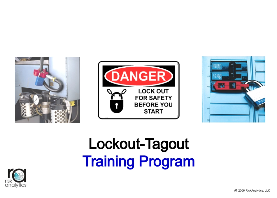 2006RiskAnalytics,LLCPage1Lockout-TagoutTrainingProgram2006RiskAnalytics,LLC2006RiskAnalytics,LLCDisclaimerTheinformation,suggestionsandrecommendationscontainedhereinareforgeneralinformationalpurposesonly.Thisinformationhasbeencompiledfromsourcesbelievedtobereliable.Nowarranty,guarantee,orrepresentation,eitherexpressedorimplied,ismadeastothecorrectnessorsufficiencyofanyrepresentationcontainedherein.Relianceupon,orcompliancewith,anyoftheinformation,suggestionsorrecommendationscontainedhereininnowayguaranteesthefulfillmentofyourobligationsunderyourinsurancepolicyorasmayotherwiseberequiredbyanylaws,rulesorregulations.ThisInformationshouldnotbeconstruedasbusiness,riskmanagementorlegaladvice,orlegalopinion.Page22006RiskAnalytics,LLCPage3LearningObjectivesUnderstandthepurposeoftheenergycontrolprogramRecognitionofapplicablehazardousenergysources,andthemethodsnecessaryforenergycontrolDiscusstheprimarycausesofinjuryfromhazardousenergyUnderstandthestepsnecessarytoproperlycontrolhazardousenergywhenservicingequipmentKnowtheresponsibilitiesofAuthorizedandAffectedemployeeintermsoflogout/tagout2006RiskAnalytics,LLCPage4IntroductionWorkersservicingmachineryandequipmentareexposedtoinjuriesfromtheunexpectedenergization,startupofthemachineryorequipment,orreleaseofstoredenergyintheequipment120fatalitiesand50,000injurieseachyearWorkersinjuredfromexposuretohazardousenergyloseanaverageof24workdaysforrecoveryMostinjuriesandfatalitiesarearesultofimproperhazardousenergycontrolproceduresABureauofLaborStatisticsstudyoninjuriessufferedwhenservicingequipmentshowed80%failedtoturnoffequipment10%equipmentactivatedbysomeoneelse5%failedtocontrolpotentialenergyRemaining5%failedtoverifyeffectiveness2006RiskAnalytics,LLCPage5The“FatalFive”MainCausesofLockout/TagoutInjuries:1.Failuretostopequipmentbeforeservicing2.Failuretodisconnectequipmentfrompowersource3.Failuretodissipate(bleed,neutralize)residualenergy4.Accidentalrestartingofequipment5.FailuretoclearworkareasbeforerestartingAllinjuriesresultingfrominadequatehazardousenergycontrolprocedurescanbeprevented2006RiskAnalytics,LLCPage6TypesofHazardousEnergyMechanical–thepotentialenergyandkineticenergypresentinthecomponentsofamechanicalsystemKinetic–energypossessedbyvirtueofitsmotion•Commoninjuries:fracture,contusion,laceration,andamputationPotential–energystoredbythemechanicalsystem•Commoninjuries:fracture,contusion,laceration,andamputationElectrical–energyasaresultofageneratedelectricalpowersourceorastaticsourceCommoninjuries:shock,burns,andelectrocutionThermal–energyasaresultofmechanicalwork,radiation,chemicalreactionorelectricalresistanceCommoninjuries:burns2006RiskAnalytics,LLCPage7TypesofHazardousEnergy,continuedChemical--energyreleasedasaresultofchemicalreactionsCommoninjuries:burnsHydraulic–energyreleasedasaresultliquidsunderpressureCommoninjuries:andcontusionsPneumatic–energyreleasedasaresultofcompressedgassesunderpressureCommoninjuries:burnsandcontusions2006RiskAnalytics,LLCPage8WhatisLockout-Tagout?Lockout-TagoutisahazardavoidancetechniqueusedtopreventenergyfrombeingaccidentallyreleasedduringtheservicingofequipmentTheLockout-Tagoutstandardrequirestheadoptionandimplementationofwrittenpracticesandproceduresto:ShutdownequipmentIsolateitfromitsenergysourceorso...