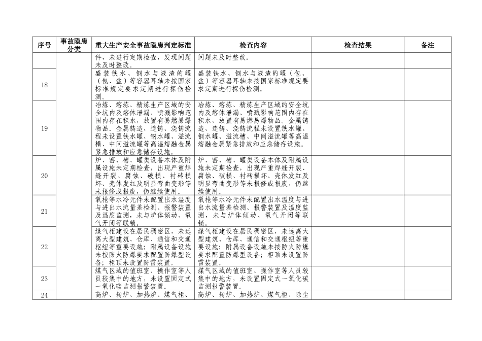 工贸行业生产经营单位重大生产安全事故隐患判定检查表序号事故隐患分类重大生产安全事故隐患判定标准检查内容检查结果备注1一、专项类重大事故隐患(一)存在粉尘爆炸危险的行业领域。粉尘爆炸危险场所设置在非框架结构的多层建构筑物内,或与居民区、员工宿舍、会议室等人员密集场所安全距离不足。粉尘爆炸危险场所设置是否在非框架结构的多层建构筑物内,或与居民区、员工宿舍、会议室等人员密集场所安全距离不足。2可燃性粉尘与可燃气体等易加剧爆炸危险的介质共用一套除尘系统,不同防火分区的除尘系统互联互通。可燃性粉尘与可燃气体等易加剧爆炸危险的介质是否共用一套除尘系统,不同防火分区的除尘系统互联互通。3干式除尘系统未规范采用泄爆、隔爆、惰化、抑爆等任一种控爆措施。干式除尘系统是否规范采用泄爆、隔爆、惰化、抑爆等任一种控爆措施。4除尘系统采用正压吹送粉尘,且未采取可靠的防范点燃源的措施。除尘系统采用正压吹送粉尘,且未采取可靠的防范点燃源的措施。5除尘系统采用粉尘沉降室除尘,或者采用干式巷道式构筑物作为除尘风道。除尘系统采用粉尘沉降室除尘,或者采用干式巷道式构筑物作为除尘风道。6铝镁等金属粉尘及木质粉尘的干式除尘系统未规范设置锁气卸灰装置。铝镁等金属粉尘及木质粉尘的干式除尘系统未规范设置锁气卸灰装置。7粉尘爆炸危险场所的20区未使用防爆电气设备设施。粉尘爆炸危险场所的20区未使用防爆电气设备设施。8在粉碎、研磨、造粒等易于产生机械点火源的工艺设备前,未按规范设置去除铁、石等异物的装置。在粉碎、研磨、造粒等易于产生机械点火源的工艺设备前,未按规范设置去除铁、石等异物的装置。9木制品加工企业,与砂光机连接的风管未规范设置火花探测报警木制品加工企业,与砂光机连接的风管未规范设置火花探测报警装置。序号事故隐患分类重大生产安全事故隐患判定标准检查内容检查结果备注装置。10未制定粉尘清扫制度,作业现场积尘未及时规范清理。未制定粉尘清扫制度,作业现场积尘未及时规范清理。11(二)使用液氨制冷的行业领域。包装间、分割间、产品整理间等人员较多生产场所的空调系统采用氨直接蒸发制冷系统。包装间、分割间、产品整理间等人员较多生产场所的空调系统采用氨直接蒸发制冷系统。12快速冻结装置未设置在单独的作业间内,且作业间内作业人员数量超过9人。快速冻结装置未设置在单独的作业间内,且作业间内作业人员数量超过9人。13(三)有限空间作业相关的行业领域。未对有限空间作业场所进行辨识,并设置明显安全警示标志。未对有限空间作业场所进行辨识,并设置明显安全警示标志。14未落实作业审批制度,擅自进入有限空间作业。未落实作业审批制度,擅自进入有限空间作业。15二、行业类重大事故隐患(一)冶金行业。会议室、活动室、休息室、更衣室等场所设置在铁水、钢水与液渣吊运影响的范围内。会议室、活动室、休息室、更衣室等场所设置在铁水、钢水与液渣吊运影响的范围内。16吊运铁水、钢水与液渣起重机不符合冶金起重机的相关要求;炼钢厂在吊运重罐铁水、钢水或液渣时,未使用固定式龙门钩的铸造起重机,龙门钩横梁、耳轴销和吊钩、钢丝绳及其端头固定零件,未进行定期检查,发现问题未及时整改。吊运铁水、钢水与液渣起重机不符合冶金起重机的相关要求;炼钢厂在吊运重罐铁水、钢水或液渣时,未使用固定式龙门钩的铸造起重机,龙门钩横梁、耳轴销和吊钩、钢丝绳及其端头固定零件,未进行定期检查,发现问题未及时整改。17吊运铁水、钢水与液渣起重机不符合冶金起重机的相关要求;炼钢厂在吊运重罐铁水、钢水或液渣时,未使用固定式龙门钩的铸造起重机,龙门钩横梁、耳轴销和吊钩、钢丝绳及其端头固定零吊运铁水、钢水与液渣起重机不符合冶金起重机的相关要求;炼钢厂在吊运重罐铁水、钢水或液渣时,未使用固定式龙门钩的铸造起重机,龙门钩横梁、耳轴销和吊钩、钢丝绳及其端头固定零件,未进行定期检查,发现序号事故隐患分类重大生产安全事故隐患判定标准检查内容检查结果备注件,未进行定期检查,发现问题未及时整改。问题未及时整改。18盛装铁水、钢水与液渣的罐(包、盆)等容器耳轴未...