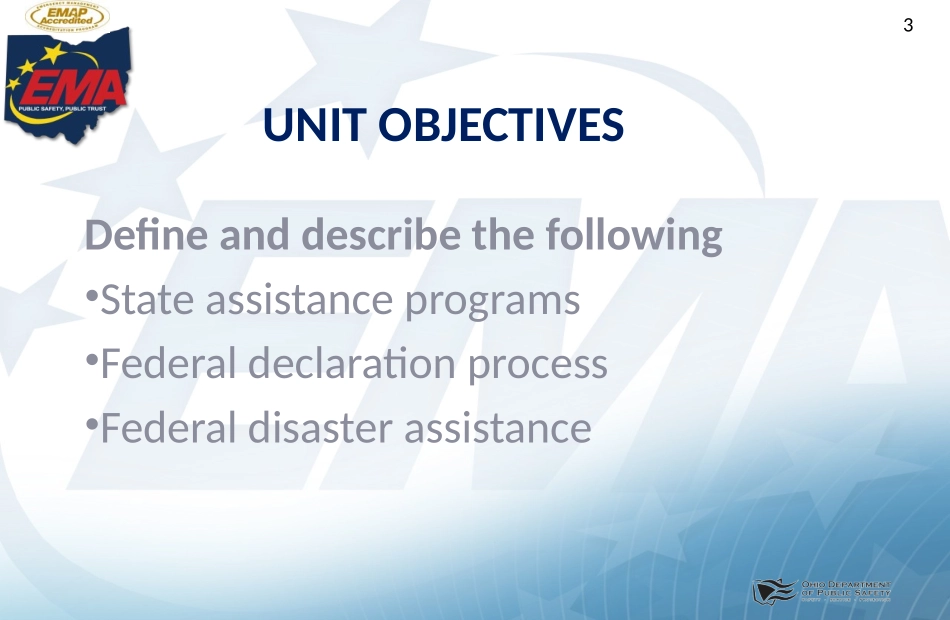 1IntroductiontoEmergencyManagementinOhioUnit8:Recovery2UNITOBJECTIVESDefineanddescribethefollowing•Recoveryplanning•Localgovernmentroleindisasterrecovery•Localandpreliminarydamageassessmentprocess3UNITOBJECTIVESDefineanddescribethefollowing•Stateassistanceprograms•Federaldeclarationprocess•Federaldisasterassistance4RECOVERYPLANNING5RECOVERYPLANNING•DevelopingaPre-disasterRecoveryPlanorAnnexwillsetthestageforrestorationofthesocioeconomicfabricofacommunity•ImplementationofsuchaPlanorAnnexdetailsaframeworkthatwillassistlocalofficialsandbusinessleadersinmaximizingthepotentialofcommunityresourcesandsupplementalprivateandpublicsectorresources6RECOVERYPLANNING•TheNationalDisasterRecoveryFramework(NDRF)bringstogetherthecorerecoverycapabilitiesofdepartmentsandagenciesandothersupportingorganizations—includingthosenotactiveinemergencyresponse—tofocusoncommunityrecoveryneeds•RecoverySupportFunctions(RSFs)areorganizedinto6componentswhererelevantstakeholdersandexpertsutilizeworktogetherinpre-disasterplanningorwhenactivatedpost-disastertoidentifyandresolverecoverychallenges7RECOVERYPLANNING–RECOVERYSUPPORTFUNCTIONS•CommunityPlanningandCapacityBuildingRSF•EconomicRecoveryRSF•HealthandSocialServicesRSF8RECOVERYPLANNING–RECOVERYSUPPORTFUNCTIONS•HousingRSF•InfrastructureSystemsRSF•NaturalandCulturalResourcesRSF9RECOVERYPLANNINGA(pre-)DisasterRecoveryPlanorAnnexshouldincludethefollowinginformation:–Purpose(s)oftheRecoveryPlan–Overviewofthecommunity/countydemographics–Adoptionand/orpromulgationprocedures–OrganizationalFramework–ConceptofOperations–PlanningProcess–PlanningConsiderations10RECOVERYPLANNINGDefinesthefollowingemergencymanagementphasesorsub-phasesforthepurposesofdisasterplanningandoperations:•Response(outlinedinemergencyoperationsplans)•Recovery(shortandlongterm)•Long-TermRecovery(tobediscussedinseparateunit)•Mitigation(tobediscussedinseparateunit)11RECOVERYPLANNING•Short-termrecovery:Short-termrecoveryoperationsaddressessentialandimmediatecommunityandcitizenneedsbyrestoringvitalservices,stabilizingtheincidentandpreservingproperty.Theseshort-termoperationsfrequentlyoverlapwiththeresponseoperations.•Examplesinclude:debrisremoval,provisionsoftemporaryfacilitiesforhousingandgovernmentaloffices,medical,heatingandmentalhealthassistanceprograms,restorationofcriticalfacilities,damageassessment,etc.12RECOVERYPLANNING•Long-termrecovery:Long-termrecoveryandmitigationoperationswillincludemissionsandissuesthatrequirespecializedassistancetoaddressuniqueneedsthatcannotbesatisfiedbyroutinedisasterassistanceprograms,orthosethatmayberequiredforcomplexrestorationorrebuildingchallenges.•Examplesinclude:widespreadmajorrepairstohousing,businessesandgovernmentalfacilitiestomakethemhabitable,casemanagementforindividualswithunmetneeds,redevelopmentofgovernmentfacilitiestobetterservecurrentcommunityneeds,communityplanning,etc.13RECOVERYPLANNINGAdministrationEmergencyResponders(Fire,Police,EMS)PublicWorks(Water,Sewer,Sanitation)CommunityPlanningEconomicDevelopmentBuildingInspectionCodeEnforcementCoordinationwithVoluntaryAgenciesSchoolsEmergencyManagementIdentifyRecoveryRoles/ResponsibilitiesofVariousDepartments14RECOVERYPLANNING-RECOVERYTASKFORCEARecoveryTaskForce:•Overseerecovery,reconstruction,andreplacementprocess.•Recommendrestorationpriorities.•Developprocedurest...