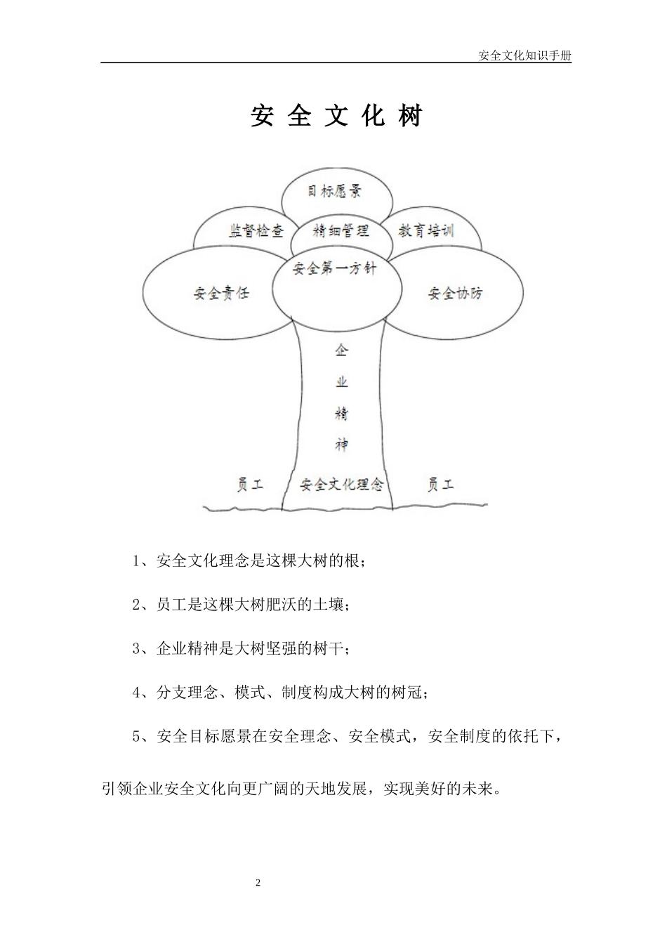 1安全文化知识手册安全文化知识手册每日安全生产出品2019.2.1712安全文化知识手册安全文化树1、安全文化理念是这棵大树的根;2、员工是这棵大树肥沃的土壤;3、企业精神是大树坚强的树干;4、分支理念、模式、制度构成大树的树冠;5、安全目标愿景在安全理念、安全模式,安全制度的依托下,引领企业安全文化向更广阔的天地发展,实现美好的未来。32安全文化知识手册前言为了加强公司安全生产管理工作,保护全体员工的生命安全和身体健康,实现安全生产与文明生产,我们应该采取多种形式,大力宣传和普及安全文化知识,强化安全意识,提高安全素质,培养安全技能,积极营造一个和谐的安全生产环境,促进安全生产实现有序可控基本稳定。安全文化是人类在社会发展过程中,在向自然界获取生活资料、生产资料活动中,为维护自身免受意外伤害而创造的各类物态产品及形成的意识形态领域成果的总和;是人类在生产活动中所创造的安全生产和生活的精神、观念、行为与物态的总和;是保护人的身心健康尊重人的生命、实现人的价值的文化。安全文化建设是预防事故的一种“软对策”和“人因工程”,以提高劳动者的安全素质为主要任务,具有保障安全的基础性意义。安全文化建设通过创造一种良好的安全人文氛围和协调的人机环境关系对人的观念、意识、态度、行为等形成从无形到有形的影响,从而对人的不安全行为产生控制作用,以达到减少人为事故的效果。安全文化建设除了关注人的知识、技能、意识、思想、观念、道德、伦理、43安全文化知识手册情感等内在素质外,还重视人的行为、设施设备、工艺工具、装臵环境等外在因素和物态条件。公司安全文化建设是一项贯穿生产经营管理全过程的长期的系统工程,需要方方面面的协调配合和各级领导的齐抓共管。展望未来,公司的安全文化建设还任重道远。路漫漫其修远,我们将一步一个脚印地推动安全文化建设工作迈上新的台阶。本手册紧密结合公司的实际情况,从安全理念、安全法规、安全名词以及安全实践等方面入手,力求融思想性、可读性和操作性为一体。本手册主要针对生产一线,面向所有职工,旨在提高职工的安全意识,提高安全操作技能,使职工实现从“要我安全”、“我要安全”到“我会安全”的转变。本手册在对职工的行为进行安全指导约束和规范的同时,也使安全文化为广大职工所认识、认知、认同和接受,并化为全体职工遵章守纪、按章作业的自觉行动,在公司形成“关注安全、关爱生命”的浓厚氛围,努力实现公司安全工作的持续改进,确保安全生产平衡发展,使安全生产成为公司的竞争优势、生存优势和发展优势,使安全生产成为我们的核心价值观。54安全文化知识手册目录目录5第一章安全文化理念篇................................................................................................7第一节形成全新的安全文化理念..............................................................................7第二节安全生产的意义和价值..................................................................................7第二章安全生产基础知识............................................................................................9第一节安全生产方针、法律法规..............................................................................91、安全生产方针............................................................................................................93、特种作业人员..........................................................................................................104、建设项目的“三同时”..........................................................................................105、安全生产教育和培训..............................................................................................106、安全卫生条件和劳动防护......................................................................................117、安全警示标志...............................