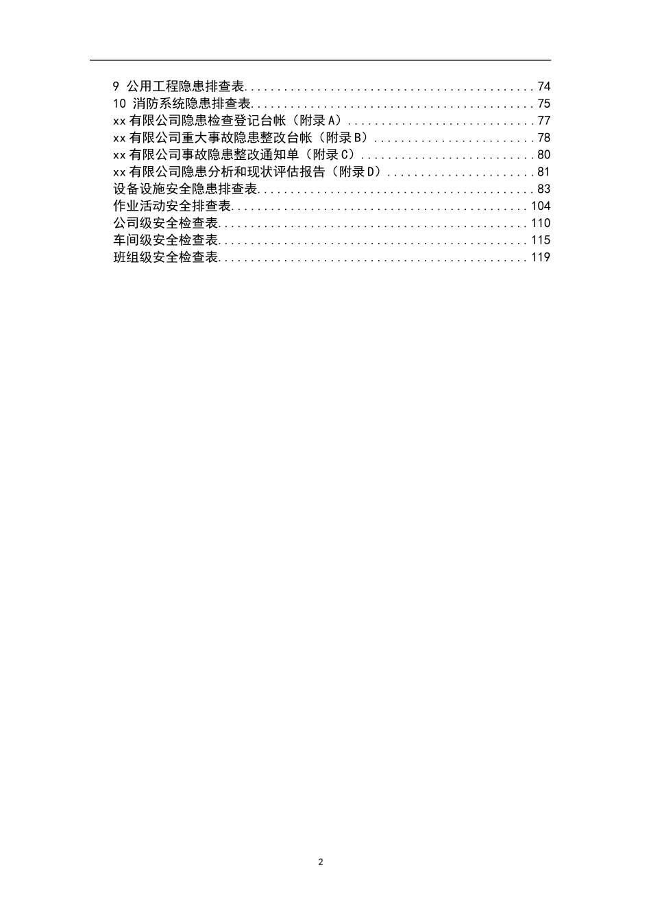 目录风险分级管控及隐患排查管理体系建设作业指导书.........................3风险点登记台账..................................................15作业活动清单....................................................15设备设施清单....................................................15风险分级管控清单................................................16风险等级对照表..................................................17(资料性附录)工作危害分析法(JHA)................................18安全检查表法(SCL).................................................19风险矩阵法(LS)....................................................21隐患排查治理作业指导书..............................................231目的..............................................................242范围..............................................................243定义..............................................................244职责..............................................................255事故隐患排查治理基本要求.........................................296事故隐患分类和等级认定...........................................317事故隐患排查方式、频次............................................358事故隐患排查内容.................................................369事故隐患的评审和评估.............................................4310事故隐患的报告和统计分析........................................4411事故隐患的处理..................................................4512隐患治理项目的验收..............................................4613事故隐患倒查....................................................47附件各专业隐患排查表................................................491安全基础管理隐患排查表........................................492区域位置及总图布置隐患排查表..................................553工艺隐患排查表................................................574设备隐患排查表................................................605电气系统隐患排查表............................................636仪表隐患排查表................................................657危险化学品管理隐患排查表......................................678储运系统隐患排查表............................................6819公用工程隐患排查表............................................7410消防系统隐患排查表...........................................75xx有限公司隐患检查登记台帐(附录A)............................77xx有限公司重大事故隐患整改台帐(附录B)........................78xx有限公司事故隐患整改通知单(附录C)..........................80xx有限公司隐患分析和现状评估报告(附录D)......................81设备设施安全隐患排查表..........................................83作业活动安全排查表.............................................104公司级安全检查表...............................................110车间级安全检查表...............................................115班组级安全检查表...............................................1192风险分级管控及隐患排查管理体系建设作业指导书2019年6月31.范围本指导书规定了xx有限公司风险分级管控体系和隐患排查治理体系建设的基本要求。本指导书适用于指导xx有限公司风险分级管控体系和隐患排查治理体系的开展。2.引用文件《安全生产风险分级管控体系通则》《生产安全事故隐患排查治理体系通则《化工企业安全生产风险分级管控体系细则》《生产安全事故隐患排查治理导则》《中华人民共和国安全生产法》《中华人民共和国职业病防治法》《中华人民共和国消防法》《xx省安全生...
