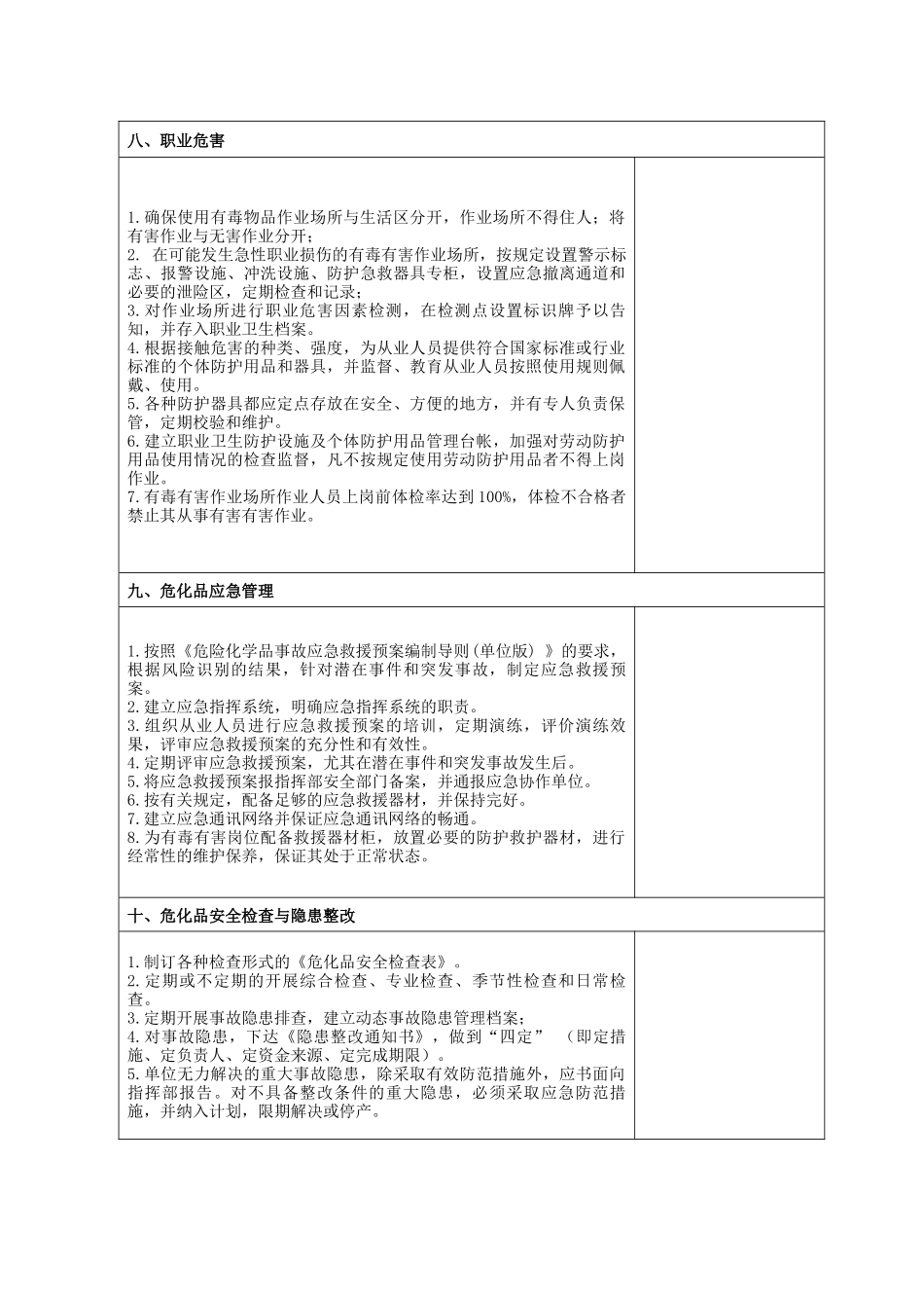 危险化学品安全管理专项检查表检查要素检查内容检查结果一、危化品管理机构和职责1.明确危险化学品安全管理部门,落实专责或兼职管理人员;2.明确管理人员及从业人员的安全职责;3.明确危化品安全管理部门、相关基层单位安全职责;二、法律法规与危化品管理制度1.收集安全生产法律法规、危险化学品管理规定、标准及其他安全管理制度;定期进行更新;2.修订和健全本单位安全生产规章制度;3.根据生产工艺、技术、设备特点和原材料、辅助材料、产品的危险性编制危化品岗位安全操作规程;4.将有关法律法规、规章制度和安全操作规程发放到有关的工作岗位,及时对从业人员进行宣传和培训;5.定期评审和修订安全生产规章制度和危化品安全操作规程。三、安全培训教育1.对危化品从业人员进行安全技能训练和安全培训教育,考核合格方可上岗;2.特种作业人员必须按照国家有关规定经专门的安全作业培训,取得特种作业操作资格证书,并按规定参加复审;3.对从事危险化学品运输的驾驶员、装卸管理人员、押运人员进行有关安全知识培训;驾驶员、装卸管理人员、押运人员须经所在地交通部门考核合格,取得上岗资格证,方可上岗作业;4.新工艺、新技术、新装置、新产品投产前,其主管部门应组织编制新的安全操作规程,并进行专门培训。有关人员经考核合格,方可上岗操作。5.对新从业人员进行厂、车间、班组安全培训教育;6.对转岗、干部顶岗以及脱离岗位六个月以上者,应进行厂、车间安全培训教育,经考试合格后,方可从事新岗位工作;7.对外来参观、学习等人员进行有关安全规定及安全注意事项的安全培训教育;8.对外来施工单位的作业人员进行入厂前安全培训教育,经考核合格发放入厂证。进入作业现场前,应由作业现场所在单位进行进入现场前安全培训教育。9.危化品从业基层单位、班组应开展班组安全活动;班组安全活动应有内容、有记录;四、重大危险源管理1.确定单位的重大危险源,建立重大危险源管理制度;2.重大危险源应登记建档,进行定期检测、评估、监控;3.针对重大危险源制定应急预案,告知单位员工和相关人员在紧急情况下应采取的应急措施;五、危化品生产(储存、使用)设备设施1.制订危化品设备设施安全管理制度;2.建立设备设施台帐;3.各种安全设施应有专人负责管理,定期检查和维护保养并落实到人。安全设施应编入设备检修计划,定期检修。4.根据危险化学品的种类、特性,在车间、库房等作业场所设置相应的安全设施、设备,并按照国家标准和有关规定进行维护、保养,符合安全运行要求;5.建立危化品特种设备台帐和档案,定期检测检验,证件齐全。特种设备操作人员持证上岗。6.建立危化品监测设备(仪器)台帐,定期进行校准和维护,并保存校准和维护活动的记录。7.制定关键装置、重点部位安全管理制度,实行单位领导人员定点挂点的安全管理机制;8.挂点领导对所负责的关键装置、重点部位负有安全监督与指导责任,并至少每月到挂点部门和部位进行一次安全活动;9.建立关键装置、重点部位档案及安全检查制度,定期进行巡检;10.制定关键装置、重点部位应急预案,至少每年进行一次演练。11.建立危化品设备设施安全检维修管理制度,明确检维修时机和频次;12.制定检维修计划;13.进行检维修前,对检维修作业进行风险评价,采取有效的措施控制风险;六、现场作业安全1.对动火、进入受限空间、动土、临时用电、高处作业等实施作业许可票管理,严格履行审批手续。2.在易燃易爆、有毒有害场所的适当位置张贴警示标志和告知牌;3.在可能产生严重职业危害作业岗位的醒目位置设置警示标志和警示说明,告知产生职业危害的种类、后果、预防及应急救治措施等内容;4.在检维修、施工、吊装等作业现场设置警戒区域和警示标志。5.对动火、进入受限空间、临时用电、高处作业、起重、动土、施工作业、高温作业等直接作业环节进行风险分析,制定控制措施,配备、使用安全防护用品,配备监护人员;6.制订和履行严格的危险化学品储存、出入库安全管理制度及运输、装卸安全管理制度。七、产品安全与危害告知1.对所有可能接触和产生的危险化学品(包括产品、原料和中间体)进行普查,建立危险化学品档案。2....