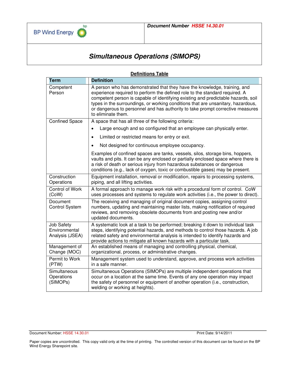 DocumentNumberHSSE14.30.01SimultaneousOperations(SIMOPS)BPWINDENERGYOPERATIONSPOLICIESANDPROCEDURESSimultaneousOperations(SIMOPS)DocumentControlDetailsDocumentNumber:HSSE14.30.01PrintDate:9/14/2011Papercopiesareuncontrolled.Thiscopyvalidonlyatthetimeofprinting.ThecontrolledversionofthisdocumentcanbefoundontheBPWindEnergySharepointsite.DocumentNumberHSSE14.30.01SimultaneousOperations(SIMOPS)1.0Purpose/Scope1.1Thisprocedureoutlinestheprocessesandgeneralplanforconductingsimultaneousoperations(SIMOPS)soastoprovideforthesafetyofpersonnelandprotectionoftheenvironmentandequipment.1.2SIMOPSshallbecoordinatedthroughjointplanningeffortsbytheseparateoperations,suchasdevelopment,construction,andoperationsmanagers/supervisors/engineerswhoplananddirectactivities.1.3ThisprocedureappliestoallBPWindEnergymanagedfacilitiesandsites.Note:1.1Thisprocedureshallbeusedasaminimum.Supplementalplansshallbepreparedforsitespecificoperationsandshouldincludeadescriptionoftheoperationstobeconductedandanyspecialprecautionsthatwillberequired.2.0Reference2.1TheReferencesectionisusedtoprovidealistofotherdocumentsreferredtointhisprocedure.2.2Therearenootherreferencesforthisprocedure.3.0AcronymsandDefinitionsAcronymsTableAcronymDefinitionCoWControlofWorkHSSEHealth,Safety,Security,andEnvironmentalJSEAJobSafetyEnvironmentalAnalysisMOCManagementofChangePTWPermittoWorkSIMOPSSimultaneousOperationsSPMSafePracticesManualSPUStrategicPerformanceUnitDocumentNumber:HSSE14.30.01PrintDate:9/14/2011Papercopiesareuncontrolled.Thiscopyvalidonlyatthetimeofprinting.ThecontrolledversionofthisdocumentcanbefoundontheBPWindEnergySharepointsite.DocumentNumberHSSE14.30.01SimultaneousOperations(SIMOPS)DefinitionsTableTermDefinitionCompetentPersonApersonwhohasdemonstratedthattheyhavetheknowledge,training,andexperiencerequiredtoperformthedefinedroletothestandardrequired.Acompetentpersoniscapableofidentifyingexistingandpredictablehazards,soiltypesinthesurroundings,orworkingconditionsthatareunsanitary,hazardous,ordangeroustopersonnelandhasauthoritytotakepromptcorrectivemeasurestoeliminatethem.ConfinedSpaceAspacethathasallthreeofthefollowingcriteria:Largeenoughandsoconfiguredthatanemployeecanphysicallyenter.Limitedorrestrictedmeansforentryorexit.Notdesignedforcontinuousemployeeoccupancy.Examplesofconfinedspacesaretanks,vessels,silos,storagebins,hoppers,vaultsandpits.Itcanbeanyenclosedorpartiallyenclosedspacewherethereisariskofdeathorseriousinjuryfromhazardoussubstancesordangerousconditions(e.g.,lackofoxygen,toxicorcombustiblegases)maybepresent.ConstructionOperationsEquipmentinstallation,removalormodification,repairstoprocessingsystems,piping,andallliftingactivities.ControlofWork(CoW)Aformalapproachtomanageworkriskwithaproceduralformofcontrol.CoWusesprocessesandsystemstoregulateworkactivities(i.e.,thepowertodirect).DocumentControlSystemThereceivingandmanagingoforiginaldocumentcopies,assigningcontrolnumbers,updatingandmaintainingmasterlists,makingnotificationofrequiredreviews,andremovingobsoletedocumentsfromandpostingnewand/orupdateddocuments.JobSafetyEnvironmentalAnalysis(JSEA)Asystematiclookatatasktobeperformed;breakingitdowntoindividualtasksteps,identifyingpotentialhazards,andmethodstocontrolthosehazards.Ajobrelatedsafetyandenvironmentalanalysisisintendedtoidentifyhazardsandprovideactionstomitigateallknownhazardswithaparticularta...