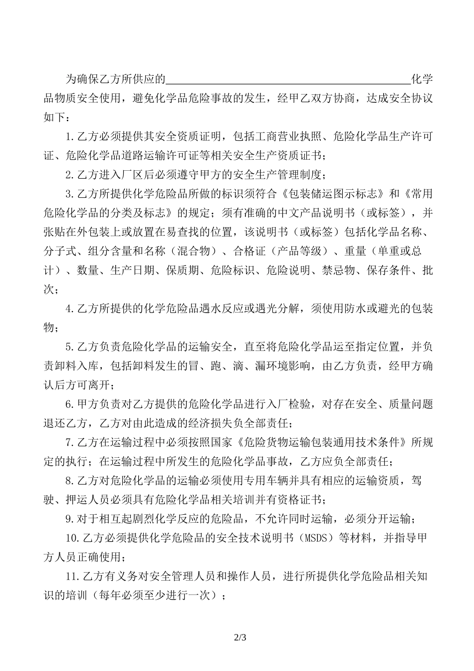 化学危险品供应商安全协议甲方(签章):乙方(签章):法定代表或授权代表(签字):法定代表或授权代表(签字):地址:地址:电话:电话:传真:传真:签署日期:签署日期:一、目的为了各个化学品供应商对化学危险品的安全管理,满足环保安全管理法规要求,杜绝化学危险品的冒、跑、滴、漏对环境影响;为确保乙方向甲方供货的产品满足甲方《安全标准化》、《ISO14001环境管理体系》、《OHSAS18001职业安全健康管理体系》等环境预防安全管理的要求,明确双方责任以及避免造成双方不必要的损失,特制定本协议。二、范围本协议适用于乙方提供给甲方或代甲方处理化学危险品、危险品设备的供应商,具体范围如下:1)若乙方为甲方的供应商,本协议管控范围为:乙方直接或通过第三方向甲方交付的化学品的浓度、安全运输、存放设备的安全管理以及住我司现场管理的作业过程,设备/仪器的使用、搬运的操作全部在内对于危险化学品的安全管理;2)若乙方为甲方的外包商,本协议管控范围为:乙方在加工过程中使用的生产化学品材料、化学品使用的相关生产设备/设施、检查台、检测仪器以及乙方提供的相应包装材料在内对于危险化学品的安全管理。三、协议内容1/3为确保乙方所供应的化学品物质安全使用,避免化学品危险事故的发生,经甲乙双方协商,达成安全协议如下:1.乙方必须提供其安全资质证明,包括工商营业执照、危险化学品生产许可证、危险化学品道路运输许可证等相关安全生产资质证书;2.乙方进入厂区后必须遵守甲方的安全生产管理制度;3.乙方所提供化学危险品所做的标识须符合《包装储运图示标志》和《常用危险化学品的分类及标志》的规定;须有准确的中文产品说明书(或标签),并张贴在外包装上或放置在易查找的位置,该说明书(或标签)包括化学品名称、分子式、组分含量和名称(混合物)、合格证(产品等级)、重量(单重或总计)、数量、生产日期、保质期、危险标识、危险说明、禁忌物、保存条件、批次;4.乙方所提供的化学危险品遇水反应或遇光分解,须使用防水或避光的包装物;5.乙方负责危险化学品的运输安全,直至将危险化学品运至指定位置,并负责卸料入库,包括卸料发生的冒、跑、滴、漏环境影响,由乙方负责,经甲方确认后方可离开;6.甲方负责对乙方提供的危险化学品进行入厂检验,对存在安全、质量问题退还乙方,乙方对由此造成的经济损失负全部责任;7.乙方在运输过程中必须按照国家《危险货物运输包装通用技术条件》所规定的执行;在运输过程中所发生的危险化学品事故,乙方应负全部责任;8.乙方对危险化学品的运输必须使用专用车辆并具有相应的运输资质,驾驶、押运人员必须具有危险化学品相关培训并有资格证书;9.对于相互起剧烈化学反应的危险品,不允许同时运输,必须分开运输;10.乙方必须提供化学危险品的安全技术说明书(MSDS)等材料,并指导甲方人员正确使用;11.乙方有义务对安全管理人员和操作人员,进行所提供化学危险品相关知识的培训(每年必须至少进行一次);2/312.对于剧毒或有毒化学品的包装(桶)或残液,由甲方负责归类、存放,乙方负责定期统一回收处理;13.乙方应建立针对甲方发生化学危险品事故的应急救援预案,并在甲方发生事故时,派专业人员到达现场积极协助甲方进行事故应急处理;14.乙方因操作不当而出现的安全事故所产生的一切后果由乙方负全部责任。四违约责任4.1若甲方发现乙方提供的化学材料的浓度达不到甲方的采购要求时,每发现一次罚款5000-10000元不等;而且当批货物全部退回乙方;4.2乙方在甲方地操作危险品发生泄漏、爆炸、化学品使用设备、容器发生异常等,全部损失由乙方承担,而且每发生一次罚款1000元。甲方的损失(包括:甲方客户交期索赔费用、物品的损坏费用、政府及社会的影响的行政处罚等费用、甲方客户流失损失及声誉损失费用等)均由乙方承担。4.3.乙方违背协议内容的条件要求时,每次甲方扣压货款增加一个月;五争议处理发生争议可由董事层和平协议处理,协商不成,在事发所在地法院仲裁处理。六其它6.1本协议经甲、乙双方协商达成一致;一式二份,由甲、乙双方各执一份。6.2本保证书加盖公司公章有效,不因签名人员的调...