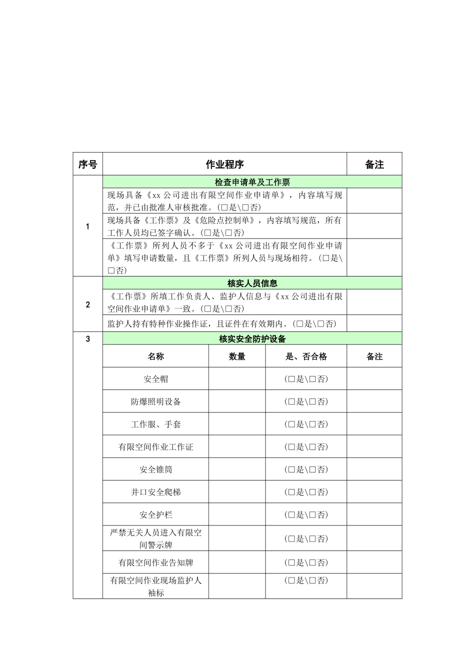 有限空间作业现场许可单作业地点:作业内容:作业范围:作业时间:发包方:作业单位:作业负责人:联系电话:许可单编号:序号作业程序备注1检查申请单及工作票现场具备《xx公司进出有限空间作业申请单》,内容填写规范,并已由批准人审核批准。(□是\□否)现场具备《工作票》及《危险点控制单》,内容填写规范,所有工作人员均已签字确认。(□是\□否)《工作票》所列人员不多于《xx公司进出有限空间作业申请单》填写申请数量,且《工作票》所列人员与现场相符。(□是\□否)2核实人员信息《工作票》所填工作负责人、监护人信息与《xx公司进出有限空间作业申请单》一致。(□是\□否)监护人持有特种作业操作证,且证件在有效期内。(□是\□否)3核实安全防护设备名称数量是、否合格备注安全帽(□是\□否)防爆照明设备(□是\□否)工作服、手套(□是\□否)有限空间作业工作证(□是\□否)安全锥筒(□是\□否)井口安全爬梯(□是\□否)安全护栏(□是\□否)严禁无关人员进入有限空间警示牌(□是\□否)有限空间作业告知牌(□是\□否)有限空间作业现场监护人袖标(□是\□否)四合一有害气体检测仪(□是\□否)发电机及接地装置(□是\□否)电源轴及漏电保护插座(□是\□否)鼓风机(□是\□否)名称数量是、否合格备注排风机(□是\□否)反光马甲(红)工作负责人(□是\□否)反光马甲(黄)专业监护人(□是\□否)对讲机(□是\□否)全方位安全带及安全绳索(□是\□否)救援三角架(□是\□否)防坠器(□是\□否)逃生呼吸器(□是\□否)井下作业人员每人一台正压式呼吸机(□是\□否)红色闪烁灯(□是\□否)高可视警示服(□是\□否)4许可前准备工作许可人向作业单位交待作业范围,检查作业单位封闭作业区域,设置安全警示,设备自检情况。(□是\□否)许可人留取影像资料。(□是\□否)许可人要求作业单位开启出入口(电力隧道、双孔井至少开启两个出入口),由作业单位进行持续机械通风。(□是\□否)许可人要求作业单位在地下有限空间外的上风口对电缆通道内部环境进行观察,存在积水的,检查作业单位应在地下有限空间外采取的排水措施。(□是\□否)许可人要求作业单位在地下有限空间外的上风口对地下有限空间气体进行检测并记录。(□是\□否)5工作许可许可人签字:时间:年月日时分工作负责人签字:时间:年月日时分许可人于年月日时分,将本次许可计划执行情况电话通知本单位管理部门(具体人员姓名)。注:一式两份,一份由许可单位存档,一份由作业单位留存。