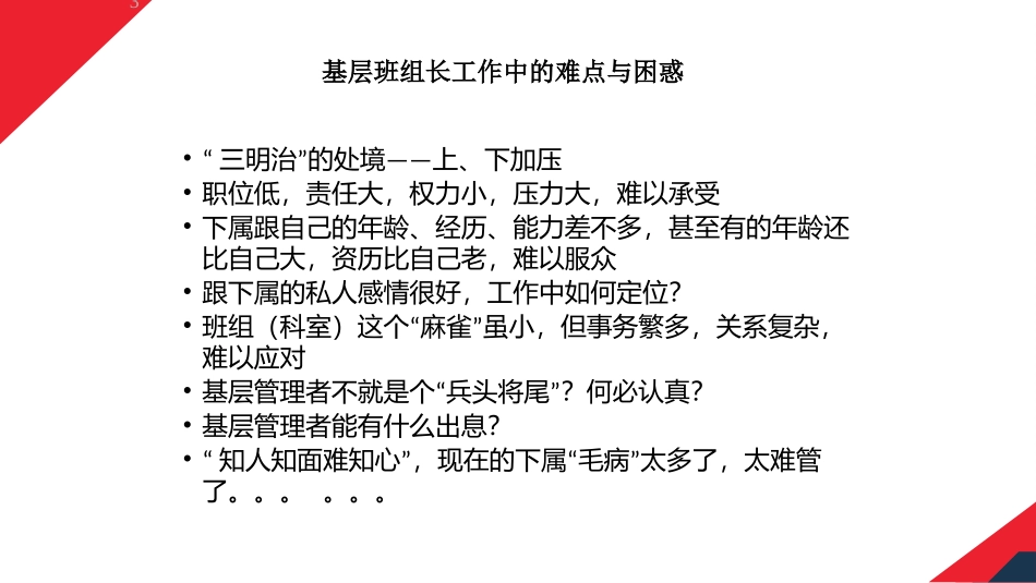 管理人员尽职履责培训一线车间常见管理现状1.上级骂、下属怨,生产现场忙得脚朝天,现场管理依然乱糟糟…2.任务完不成找我,员工有情绪找我,效率、质量搞不好也找我…3.手下一管就是几十号人,做事行,管人、带人,让这群人顺顺畅畅完成工作可就…4.任务变化频繁,会这个,不会那个,人一堆,岗位却常常缺人手,怎么办?5.大错不犯,小错不断,员工老是违反纪律,怎么让员工改正?6.表现不好,说他几句,表面应承,后面跟你对着干,怎么让员工接受主管意见?7.我们基层管理人员既决定不了员工薪水,也决定不了公司的环境,怎么激励手下这些人?基层班组长工作中的难点与困惑•“三明治”的处境——上、下加压•职位低,责任大,权力小,压力大,难以承受•下属跟自己的年龄、经历、能力差不多,甚至有的年龄还比自己大,资历比自己老,难以服众•跟下属的私人感情很好,工作中如何定位?•班组(科室)这个“麻雀”虽小,但事务繁多,关系复杂,难以应对•基层管理者不就是个“兵头将尾”?何必认真?•基层管理者能有什么出息?•“知人知面难知心”,现在的下属“毛病”太多了,太难管了。。。。。。302/01/2025如何破解这些难题?本次培训的目的增强班组管理技能提高班组管理技巧提升班组自控能力主要内容安全生产刑案司法解释现代安全管理理念班组基础和现场安全管理班组安全管理班组长安全角色认知班组安全管理经验安全生产刑案司法解释01安全生产刑案司法解释“两高”关于安全生产刑案司法解释2015年12月15日上午,最高人民法院、最高人民检察院和国家安全监管总局联合召开新闻发布会,向社会公布最高法、最高检联合制定的《关于办理危害生产安全刑事案件适用法律若干问题的解释》,司法解释将于2015年12月16日起施行。二、《刑九》主要内容与解释对照理解•与生产安全有关的刑事犯罪罪名(共十四种):(1)铁路运营安全事故罪;(2)重大责任事故罪;(3)强令违章冒险作业罪;(4)重大劳动安全事故罪;(5)大型群众性活动重大安全事故罪;(6)危险物品肇事罪;(7)工程重大安全事故罪;(8)教育设施重大安全事故罪;(9)消防责任事故罪;(10)不报、谎报安全事故罪;(11)生产、销售不符合安全标准的产品罪;(12)滥用职权罪;(13)玩忽职守罪;(14)徇私舞弊不移交刑事案件罪。安全生产刑案司法解释•(二)《刑九》第一百三十四条第一款规定的是“重大责任事故罪”的情形;具体规定为:•“在生产、作业中违反有关安全管理的规定,因而发生重大伤亡事故或者造成其他严重后果的,处三年以下有期徒刑或者拘役;情节”特别恶劣的,处三年以上七年以下有期徒刑。•本款明显缺乏主语,即犯罪主体,法释〔2015〕22号司法解释对犯罪主体的范围解释为“对生产、作业负有组织、指挥或者管理职责的负责人、管理人员、实际控制人、投资人等人员,以及直接从”事生产、作业的人员。安全生产刑案司法解释•《刑九》第一百三十四条第二款规定的是“强令违章”冒险作业罪的情形,具体规定为:•“强令他人违章冒险作业,因而发生重大伤亡事故或者造成其他严重后果的,处五年以下有期徒刑或者拘”役;情节特别恶劣的,处五年以上有期徒刑。•本款还是缺乏主语,即犯罪主体,法释〔2015〕22号司法解释对犯罪主体的范围解释为“对生产、作业负有组织、指挥或者管理职责的负责人、管理人员、”实际控制人、投资人等人员。安全生产刑案司法解释•(三)《刑九》第一百三十五条第一款规定的是“重大劳动安全事故罪”的情形,具体规定为:•“安全生产设施或者安全生产条件不符合国家规定,因而发生重大伤亡事故或者造成其他严重后果的,对直接负责的主管人员和其他直接责任人员,处三年以下有期徒刑或者拘役;情节特别恶劣的,处三年以上”七年以下有期徒刑。安全生产刑案司法解释安全生产刑案司法解释(一)明确入罪标准这则司法解释对定罪量刑标准作出明确规定,原则上以死亡一人、重伤三人,或者造成直接经济损失一百万元作为入罪标准。(二)哪些情形将从重、从轻处罚?关闭、破坏必要的安全监控和报警设备的;已经发现事故隐患、经有关部门或者个人提出后,仍不采取措施。《...