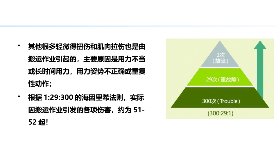 HandlingSafety搬运作业中的安全公众号:ehs文库2022年8月•本年度天津基地因搬运作业引发的安全事故共有5起,占所有事故总数的19%;•受伤的部位包括手部、脚部和肋部;搬运作业引发的安全事故•其他很多轻微得扭伤和肌肉拉伤也是由搬运作业引起的,主要原因是用力不当或长时间用力,用力姿势不正确或重复性动作;•根据1:29:300的海因里希法则,实际因搬运作业引发的各项伤害,约为51-52起!•人体的脊柱有四个生理弯曲(颈曲、胸曲、腰曲和骶曲)支撑身体重量,搬运过程中的重量会对脊柱产生巨大的压力,而脊柱一旦受伤就很难恢复,即使恢复后,也有可能会有椎间盘突出,骨质增生等病症。•人工搬运中的关键要点就是要保持身体的正常四个生理弯曲,而不产生其它的脊柱弯曲,尽量减少对脊柱的压力。人体的脊椎保持腰部挺直,是人工搬运技术中的重中之重。承载力和稳定性随手与脊柱底的水平距离而减少承载力%手与脊柱底的水平距离(cm)TEST脊柱承受的压力平躺侧卧直立弯腰提起重物正坐驼背坐蹲坐25%75%100%150%220%140%185%275%体力搬运重量限值中华人民共和国国家标准GB12330-90ÐÔ±ð°áÔËÀà±ðµ¥Î»°áÔË·½Ê½°á¿¸ÍÆ»òÀµ¥´ÎÖØÁ¿kg1550300ÄÐÈ«ÈÕÖØÁ¿t182030*tm903003000µ¥´ÎÖØÁ¿kg1020200ŮȫÈÕÖØÁ¿t81016*tm401501600*:È«ÈÕ°áÔËÖØÁ¿ºÍÏàÓ¦²½ÐоàÀëµÄ³Ë»ý,ÒÔ¶ÖÃ×±íʾ从事装卸搬运的工人,每人连续工作两小时后,应有不少于十分钟的间歇时间如何正确进行搬运作业?TEST•将负载搬至何处?•如果可能,使用适宜的辅助搬运设备•需要其它帮助吗?•清除搬运通道上的障碍物•若举程过长(如从地面举至肩膀),考虑使用中转(如桌子)以变换把持负载方式。1.停下来,想一想注意:两脚分开基本与肩同宽,保持平衡及稳定,将腿尽可能靠前•弯膝•当抓握负载时,使双手高度尽可能与腰部位置一致•不要跪倒或过度放松膝盖•挺直腰部(收紧下巴)•身体稍倾靠前把好负重•保持肩膀平衡并使其与髋骨处于同一方向2-3.采用正确姿势注意:抓牢把手或负重,不要急促将负重抬起慢慢抬起和控制好负重移动双脚•当转身时,不要扭转躯干身体靠近负重•保持较重一侧靠近身体放下负载,然后调整•将负载放下然后将其推至指定位置4-5.移动和放下重物15432正确搬运方法一想二看三检查,摆好双脚不弯腰,双手搬运不逞强,慢慢移动手抓牢。搬运作业七言绝句別急!停一下,想一想正确位置,高度调整合适的姿势适当的工具移动脚,別强扭腰搬运物要尽量靠近自身要调整搬运物前一定先放下总结一下大于60kg,不得人工搬运(包括联合搬运),需机械辅助搬运小型手动液压葫芦滚动轴式传送装置大型板材运送装置小型液压起吊运输车简携式小推车移动式电葫芦电动真空提升机1.心理搬运2.实际搬运估计物体的重量正确地搬运.1.靠近物体,抓牢物体,抱起物体!2.保持背部的自然挺直,利用强壮的腿部肌肉抬起物体3.平稳的放下物体.如何正确搬运作业?1.心理搬运2.实际搬运请求帮助.团队搬运.当团体搬运时,选一人喊口号。带头人要指导团队同时抬起,步调一致,同时放低重物,运用搬运规则和技巧。大的重物如何搬运?2.实际搬运1.心理搬运找到更好的方法.推,不要拉.使用正确的搬运方法装载机械设备可能的话,用推而不是去拉卸载:使用正确的方法反向卸载有没有其他办法代替人工搬运?清理通道.清除所有你看到的隐患或者确认他们已经被移走。清理地面上洒漏的液体。确认区域照明良好。等待道路通畅。然后运输物体,将物体放在合适的地点。检查通道.2.实际搬运1.心理搬运搬运前做好准备工作1.心理搬运2.实际搬运解决高处搬运问题。向上推举测试物体的重量。尽量靠近重物,以便可以顺着身体滑下用举起的方法放下–正确的方法。小心搬下尽量安全的将重物放下。高处的物品如何搬运?1.心理搬运2.实际搬运少搬一点,享受成果!解决重复性问题•不要因为“事情一直就是这样的”而接受现状•承认问题存在并决定如何在以后避免这种问题。物料搬运周转车应该推,不要拉.宁愿推两次也不拉一次,因为这样...