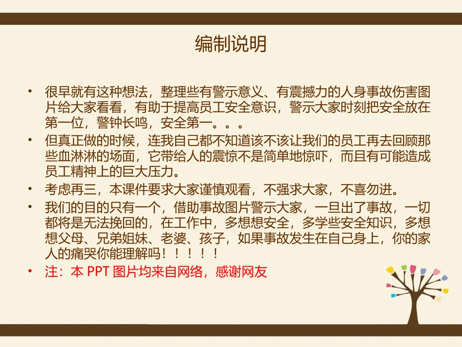 超震撼的人身伤害照片本片只作为内部观看,内容血腥,惨不忍睹,但警示意义深刻,请大家选择观看。。。人生美好步步小心关爱生命重视安全编制说明•很早就有这种想法,整理些有警示意义、有震撼力的人身事故伤害图片给大家看看,有助于提高员工安全意识,警示大家时刻把安全放在第一位,警钟长鸣,安全第一。。。•但真正做的时候,连我自己都不知道该不该让我们的员工再去回顾那些血淋淋的场面,它带给人的震惊不是简单地惊吓,而且有可能造成员工精神上的巨大压力。•考虑再三,本课件要求大家谨慎观看,不强求大家,不喜勿进。•我们的目的只有一个,借助事故图片警示大家,一旦出了事故,一切都将是无法挽回的,在工作中,多想想安全,多学些安全知识,多想想父母、兄弟姐妹、老婆、孩子,如果事故发生在自己身上,你的家人的痛哭你能理解吗!!!!!•注:本PPT图片均来自网络,感谢网友特别警示•本PPT内容血腥,观看者慎入!!!•有高血压、心脏病者慎入!!!胆小者慎入!!!女员工慎入!!!妻子淋浴触电呼救丈夫踹门救妻遭电击身亡2004年4月21日,一电信线路维护工在南京市玄武区童卫路从窨井下作业完后爬出窨井时,因没有向四周观看,被一辆疾驰而来的面包车撞到头部,当场死亡2005年1月5日发生在青海省玉树藏族自治州境内的特大交通事故遇难55人。重物从车上翻下,正砸中一小伙子,尸体四分五裂。。。。烧伤照片烧伤照片高处坠落照片高处坠落照片谁都不愿看到这样的结果风险无处不在,危险处处相随鲜血换来的规程,你还想违规吗?!请看调查数据,4%和64%里有你吗?立即改正吧!!生命无价,平安是福,安全责任、重在落实