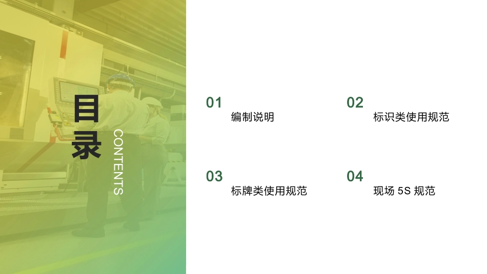 现场标识、标牌类布置标准及5S规范01编制说明02标识类使用规范03标牌类使用规范04现场5S规范目录CONTENTS01编制说明编制说明1☉术语:生产场地布置(ProductionAreaOrganization)简称为PAO。☉目的:保证安全、清洁和有序的工作场所布置,排除任何不需要的东西,为每件物品提供一个特定的位置,为工作的标准化和提高效率提供条件。使偏离标准的情况显而易见,是不断改进的起点。☉要求:①各个区域严格按照PAO的标准执行,并定期进行检查整改。②对于标准的更改需要遵循统一的流程。③培训员工相关的PAO标准。④PAO标准下发各个区域且方便员工获得。☉适用范围:适用于所有与生产相关区域,包括生产工位、办公区域、生活设施区域等。本标准有两部分组成,工厂通用部分和部门特有标准。☉备注:①本标准需要及时更新,原则上每年至少评审一次。②更新后的标准要及时培训员工。③更改流程见《PAO管理流程》安全颜色示例对比颜色示例说明红色白色Text传递禁止、停止、危险或者提示消防设备、设施的信息黄色黑色Text传递注意、警告的信息绿色白色Text传递安全的提示性信息蓝色白色Texta)传递必须遵守规定的指令性信息b)信息标示以下要求来源于《GB2983-2008安全色》(安全颜色-蓝色对应说明中的b)信息标示除外)橙色NAText较红色低一级的安全标识黄黑色NAText表示危险位置的安全标记编制说明102标牌类使用规范标示禁止、停止、消防和危险的意思。凡是禁止、停止和有危险的器件设备或环境,应涂以红色的标记。(《GB2893-2008安全色》)2.1.1禁止、限制标示(《GB2894-2008安全标志及其使用导则》)①禁止标志的基本形式是带斜杠的圆边框,基本型式的参数如下:外径d1=0.025L;内径d2=0.800d1;斜杠宽c=0.080d2;斜杠与水平线的夹角ɑ=45°;L为观察距离(见表格)。②如有文字辅助标志,基本形式为矩形边框,文字辅助标志写在标志的下方,可以和标志连在一起,也可以分开。衬底色为标志颜色,字体颜色为白色,字体为微软雅黑。标识类使用规范22.1红色标识RAL3000观察距离L圆形标志的外径d110