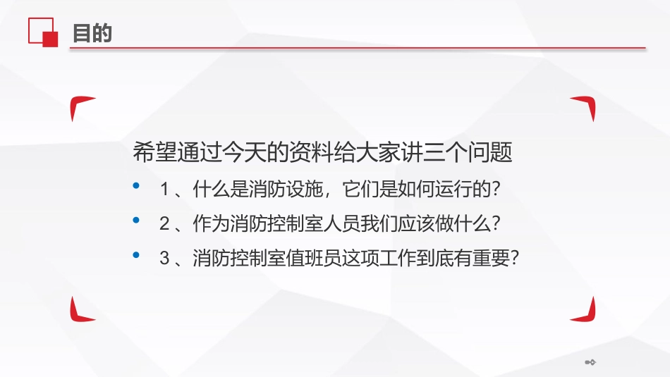 消防控制室1目的希望通过今天的资料给大家讲三个问题1、什么是消防设施,它们是如何运行的?2、作为消防控制室人员我们应该做什么?3、消防控制室值班员这项工作到底有重要?2几个问题火灾自动报警系统发出火灾信号后,作为值班人员你应该如何处理?火情得到确认后,你应该开展哪些工作?向119报警的主要内容有哪些?假如初期火灾发生在5楼,消防广播的具体告知的范围是哪几层?3内容摘要消防控制室的概述消防控制室的日常管理消防控制室火灾事故紧急处理程序4一、消防控制室概述消防控制室与消防设施消防控制室的设计要求消防控制室内设备的布置消防控制室设备的组成火灾探测报警消防控制室的控制功能51.1消防控制室与消防设施建筑消防设施的设计原则:立足于自防自救、立足于早期发现、早期报警和早期控制。什么是消防控制室消防控制室是通过设置的火灾自动报警设备和消防设施控制设备,用于接收、显示、处理火灾报警信号,控制相关消防设施的专门场所;是利用固定消防设施扑救火灾的信息指挥中心;是建筑内消防设施控制中心的枢纽。在平时是监测各种设备的工作状态,保持系统的正常运行。一旦出现火情,将紧急信息汇总、显示、处理中心,及时、准确地反馈火情的发展,正确、迅速的控制设备、达到疏导保护人员、控制和扑灭火灾的目的。6消防设施的组成建筑消防一般由火灾自动报警系统、自动灭火系统、防排烟系统、防火门、防火卷帘门、火灾事故广播、消防通讯系统等消防设备组成。而消防控制室就是这个系统的监测、控制中心。71.2消防控制室的设计要求消防控制室根据建筑物的实际情况,可独立设置、也可与监控室、综合控制室等合用,并保证专人24小时值班。8消防控制室的防火设计要求(1)1、单独建造的消防控制室,防火等级不应低于二级2、附设在建筑物内的消防控制室,应设置在首层靠外墙部位,也可设在建筑物的地下一层,其耐火极限不得低于2h隔墙、1.5h楼板与其他部位隔开,并设置直通室外的安全出口。3、严禁与消防控制室无关的电气线路和管道穿过4、消防控制室不应设在电磁场干扰较强及其他可能影响消防控制设备工作的设备用房附近5、消防控制室的门应向疏散方向开启,且入口处设明显的标志6、应设置应急照明灯,并保证正常照明的照明度7、应在配电线路的最末一级配电箱处设置自动切换配电装置91.3消防控制室内设备的布置消防控制室的消防控制设备、值班、维修人员都要占有一定的空间,为了便于设计和使用,又不造成浪费,《火灾自动报警系统设计规范》对消防控制室的控制设备的布置作了明确规定。10消防控制室内设备的布置(1)1、盘前操作距离:单列布置时不应小于1.5m,双列布置时不应小于2m。2、在值班人员经常工作的一面,控制键盘距墙的距离不应小于3m。11消防控制室内设备的布置(2)3、盘后维修距离不应小于1m4、控制盘的排列长度大于大于4m时,控制盘两端应设置宽度不小于1m的通道12消防控制室设备的组成消防控制室是消防管理、火灾救援的信息中心和指挥中心设备组成:火灾报警控制器消防联动控制器消防控制室图形显示装置火灾应急广播消防电话总机一部外线电话13火灾报警控制器1、显示屏2、打印机3、指示灯区4、按键132414火灾控制器打印机按键打印信息1215火灾联动控制器消防联动控制器一般与消防报警控制器采用一体化设计,构成联动型火灾报警控制器主要功能有:控制、故障报警、自检16多线路控制盘1、手动允许/禁止锁2、按键3、指示灯区12317多线路控制盘对于小型、简单的建筑场所,仅有报警没有联动控制功能火灾自动报警就可满足消防的要求。这类火灾自动报警系统一般由火灾报警控制器、火灾探测器、手动报警按钮、声光报警器构成。对于大型复杂的建筑场所,由于疏散困难、报警区域大、灭火设施多,需要监控的建筑消防设施不仅要有报警功能的各种火灾探测器,还应包括有关的消防联动控制装置。18消防联动控制装置主要为三类火灾应急广播及消防电话等疏散装置卷帘门控制器、防火门、新风排烟控制装置等限制火势的装置消火栓、各种自动灭火控制装置等灭火控制装置19消防控制室图形显示装置1、火灾信息显示区域2、火警记录区域...