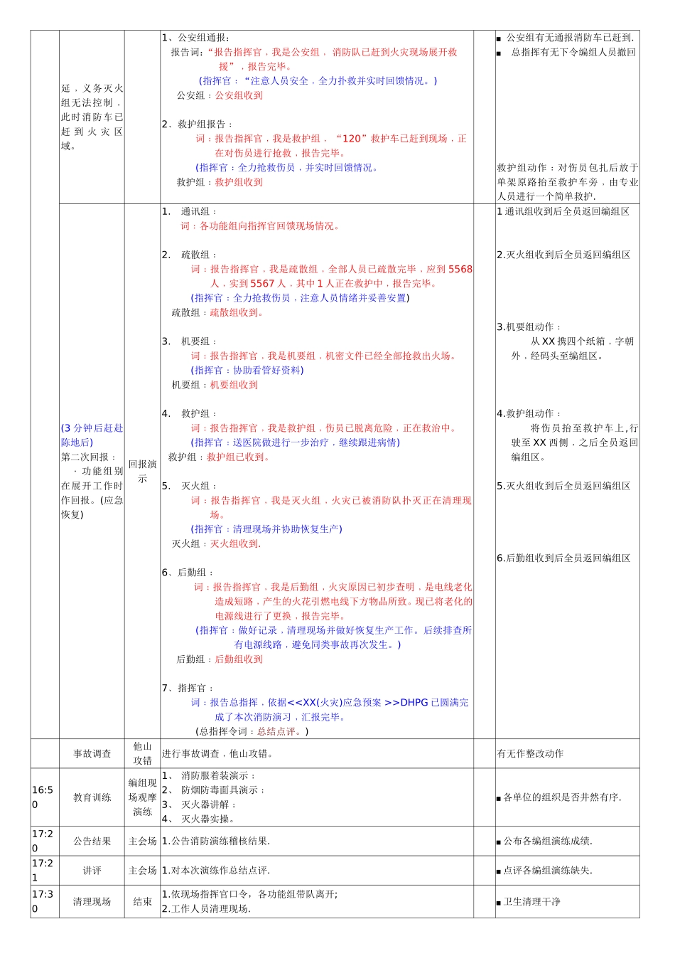 消防演习流程主题:XX消防疏散逃生应急演习演习方式:演习时间:地点:参加单位:内容:时间状况演示科目演习状况/步骤DRI考核标准13:30场地布置/1﹑演习集合场地布置)2﹑火场设置准备等﹐依据图示场地布置恰当合理各项工作准备充分16:00集合动员/1﹑消防编组人员准时集合在疏散集合地点﹕1)各编组佩戴对应袖标﹔2)公安组带雪花筒(3个/1人)和警示带﹔3)灭火组四人着消防服﹐分别携带消防铁锹一个﹑消防斧一个﹑铁剪一个和灭火器一个﹔4)机要组四人佩戴防烟防毒面具﹐四个纸箱﹔5)救护组两人着消防服﹑单架和药箱各一个﹔6)后勤组持工具箱2个2﹑方经理动员阐述消防演习的意义16:25人员就位/1﹑编组人员返回各自工作岗位(前期准备工作完成后向指挥官报告)﹕疏散组﹕各楼梯间2F/4F指派产线干部进行对疏散人员安全倡导与指引公安组﹕对外围进行警戒﹐并对疏散出的人员进行安全地点指引救护组﹕扮伤员者在XX待命其他五组﹕在XX附近待命XX﹕在预定位置听信号启动警铃.指挥官/通信可留在现场查看人员是否回岗作业16:30演习开始(1分钟后)状况一:XX栋XX楼东侧仓库﹐因线路短路发生大火(假设)报警演练点烟雾弹(听指令作业)员工报警是否正确﹕详细地址.起火物.火势情况.报警人姓名及电话号码.响警铃(听指令作业)1.员工报警﹔2.报警词﹕报告通讯组,我是XX,,XX栋XX楼东侧仓库发生大火﹐而且火灾有蔓延趋势﹐请求救援﹐我的电话是XX.(通讯组﹕通迅组收到。)(1分钟后)指挥官判断﹑指挥指挥官演练1﹑通讯组向指挥官报告﹔报告词﹕报告指挥官﹕我是通讯组,XX栋XX楼东侧仓库发生大火﹐而且火灾有蔓延趋势﹐请求指示﹗接到火警后立即报告指挥官﹔2﹑指挥官命令通信组(电话)﹕立即停止生产﹑启动消防编组﹔(从办公室出来边走边打电话)令词﹕我命令立即停止生产﹑迅速启动消防预案﹐各就各位﹐展开救援工作。(通讯组﹕通迅组收到。)3﹑指挥官向总指挥(韩协理)报告﹕报告词:报告总指挥﹐我是XX,XX栋XX楼东侧仓库﹐发生大火﹐现正组织抢救﹐现场最新状况随时向你报告。◇总指挥向指挥官下达命令﹕总指挥令词﹕调集人力、物力抢救﹐确保人员安全﹐随时回馈情况。(指挥官﹕指挥官收到)指挥官的调度是否按轻重﹐信息是否畅通﹔(1分钟后)周边单位﹕功能组应急响应动作(XX栋)通信组通报演练1﹑通信组将指令通报各消防功能编组﹕(对讲机)通报词﹕各功能小组请注意﹐现XX栋XX楼东侧仓库﹐发生大火﹐指挥官指示﹕灭火组组织灭火﹐疏散组进行疏散﹐其他小组奔赴火场展开救援工作﹐并及时报告。公安组﹕公安组收到。灭火组﹕灭火组收到。疏散组﹕疏散组收到。机要组﹕机要组收到。后勤组﹕后勤组收到。救护组﹕救护组收到。(实况时各小组依据火情可自行履行职责)信息接收﹑传达是否快速准确﹔迅速且尽可能的靠近火灾区域﹐观察火灾发展趋势作响应﹔通讯组在向各功能组通报的同时指挥官同时向总指挥报告﹔此时灭火组和机要组出发救援功能组别演练(同时作业)1.通信组﹕通知各功能组向指挥官靠拢﹔(实战动作)2.灭火组﹕从XXX出警经码头至XX(实点至着火点)3.疏散组﹕已按职责到达指定岗位并开始指导与倡导工作4.机要组﹕出警经码头至XX(实点至着火点)5.后勤组﹕出警经码头至XX(实点至着火点)6.公安组:已按职责警戒到位并开始指导疏散与倡导工作功能组有无慌乱且听指挥行动﹔灭火组﹑疏散组﹑机要组﹑后勤组﹑救护组﹑公安组信息接收﹑传递是否快速准确疏散救护人员是否定岗定位(参照消防演习疏散图)疏散组人员是否屡行职责灭火组后勤组人员是否定岗定位功能组别动作步骤功能组别演练(同时作业)1.通信组﹕通知各动能组向指挥官靠拢。(现场指挥所XX)2.灭火组﹕集合地穿戴消防服等,立即赴火场展开工作﹐并回报3.疏散组﹕迅速赴岗位展开疏散工作并回报4.机要组﹕赴岗展开抢救文件、仪器工作并回报5.后勤组﹕停电、送水、准备灭火物质等6.救护组﹕拿起急救器具向指挥官靠拢(现场指挥所)7.公安组:至重要路口、集合地、接消防车等8.信息中心﹕通知总指挥﹑相邻单位(报告词略)(2分钟后)第一次回报﹕功能组别在展开工作时作回报。回报演示1.通讯组﹕词﹕各功能组向指挥官回馈...