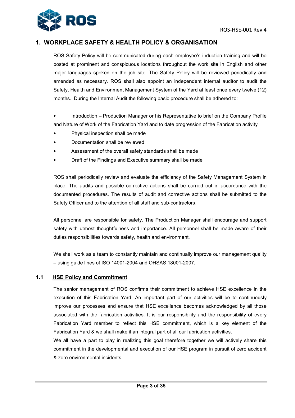 ROS-HSE-001Rev4Page1of35ROTATINGOFFSORESOLUTIONSPTELTDNO.109TUASSOUTHAVE8SINGAPORE637037T+6567788271,F+6562665927HEALTH,SAFETY&ENVIRONMENTAL(HSE)PLAN407/08/2014NewAddressM.ZakiranR.KumaranSrinivasan37/04/2014UpdatedMuhdRosliR.KumaranSrinivasan21/04/2013NewAddressMuhdRosliR.KumaranSrinivasan111/06/2012ReviewR.LoganR.KumaranSrinivasan030/11/2011AsBuiltR.LoganR.KumaranSrinivasanRevDateDescriptionPreparedReviewApprovalROS-HSE-001Rev4Page2of35S/NOCONTENTSPAGE12345678910111213141516171819WORKPLACESAFETY&HEALTHPOLICY&ORGANISATIONSAFEWORKPRACTICESFIREPREVENTIONSAFETYTRAININGGROUPMEETINGS&SAFETYCOMMITTEEACCIDENT&INCIDENTINVESTIGATION&ANALYSISIN-HOUSESAFETYRULES®ULATIONSSAFETYPROMOTIONEVALUATION,SELECTION&CONTROLOFCONTRACTORSSAFETYINSPECTIONMAINTENANCEREGIMEHAZARDANALYSISCONTROLOFMOVEMENTANDUSEOFHAZARDOUSSUBSTANCESOCCUPATIONALHEALTHPROGRAMMEENVIRONMENTALPROTECTIONEMERGENCYPREPAREDNESSPERMITTOWORKDOCUMENTCONTROL&REVIEWAPPENDIXES371616171922232424242527293131343435ROS-HSE-001Rev4Page3of351.WORKPLACESAFETY&HEALTHPOLICY&ORGANISATIONROSSafetyPolicywillbecommunicatedduringeachemployee’sinductiontrainingandwillbepostedatprominentandconspicuouslocationsthroughouttheworksiteinEnglishandothermajorlanguagesspokenonthejobsite.TheSafetyPolicywillbereviewedperiodicallyandamendedasnecessary.ROSshallalsoappointanindependentinternalauditortoaudittheSafety,HealthandEnvironmentManagementSystemoftheYardatleastonceeverytwelve(12)months.DuringtheInternalAuditthefollowingbasicprocedureshallbeadheredto:•Introduction–ProductionManagerorhisRepresentativetobriefontheCompanyProfileandNatureofWorkoftheFabricationYardandtodateprogressionoftheFabricationactivity•Physicalinspectionshallbemade•Documentationshallbereviewed•Assessmentoftheoverallsafetystandardsshallbemade•DraftoftheFindingsandExecutivesummaryshallbemadeROSshallperiodicallyreviewandevaluatetheefficiencyoftheSafetyManagementSysteminplace.Theauditsandpossiblecorrectiveactionsshallbecarriedoutinaccordancewiththedocumentedprocedures.TheresultsofauditandcorrectiveactionsshallbesubmittedtotheSafetyOfficerandtotheattentionofallstaffandsub-contractors.Allpersonnelareresponsibleforsafety.TheProductionManagershallencourageandsupportsafetywithutmostthoughtfulnessandimportance.Allpersonnelshallbemadeawareoftheirdutiesresponsibilitiestowardssafety,healthandenvironment.Weshallworkasateamtoconstantlymaintainandcontinuallyimproveourmanagementquality–usingguidelinesofISO14001-2004andOHSAS18001-2007.1.1HSEPolicyandCommitmentTheseniormanagementofROSconfirmstheircommitmenttoachieveHSEexcellenceintheexecutionofthisFabricationYard.AnimportantpartofouractivitieswillbetocontinuouslyimproveourprocessesandensurethatHSEexcellencebecomesacknowledgedbyallthoseassociatedwiththefabricationactivities.ItisourresponsibilityandtheresponsibilityofeveryFabricationYardmembertoreflectthisHSEcommitment,whichisakeyelementoftheFabricationYard&weshallmakeitanintegralpartofallourfabricationactivities.WeallhaveaparttoplayinrealizingthisgoalthereforetogetherwewillactivelysharethiscommitmentinthedevelopmentalandexecutionofourHSEprograminpursuitofzeroaccident&zeroenvironmentalincidents.ROS-HSE-001Rev4Page4of351.2Duties&Responsibilities1.2.1OperationDirector•EstablishthecompanyWSHPolicyandreviewthepolicyatleastoncein3years.•OverallinchargeoftheWSHManagementintheCompany.•Toindentifya...