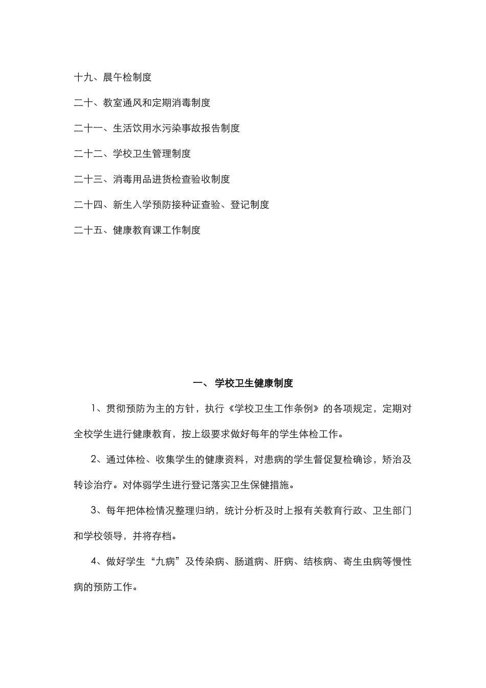 学校卫生管理各种制度汇编目录一、学校卫生健康制度二、教学卫生制度三、教室卫生制度四、劳动卫生制度五、体育卫生制度六、传染病管理制度七、个人卫生制度八、饮水卫生制度九、厕所卫生制度十、食堂膳食卫生制度十一、各办公室卫生制度十二、学校环境卫生管理制度十三、图书馆卫生与环境管理制度十四、操场卫生制度十五、学生宿舍卫生管理制度十六、传染病疫情及突发公共卫生事件报告制度十七、学校传染病疫情报告人及上报程序十八、学生因病缺勤病因追查与登记制度十九、晨午检制度二十、教室通风和定期消毒制度二十一、生活饮用水污染事故报告制度二十二、学校卫生管理制度二十三、消毒用品进货检查验收制度二十四、新生入学预防接种证查验、登记制度二十五、健康教育课工作制度一、学校卫生健康制度1、贯彻预防为主的方针,执行《学校卫生工作条例》的各项规定,定期对全校学生进行健康教育,按上级要求做好每年的学生体检工作。2、通过体检、收集学生的健康资料,对患病的学生督促复检确诊,矫治及转诊治疗。对体弱学生进行登记落实卫生保健措施。3、每年把体检情况整理归纳,统计分析及时上报有关教育行政、卫生部门和学校领导,并将存档。4、做好学生“九病”及传染病、肠道病、肝病、结核病、寄生虫病等慢性病的预防工作。5、每学期初做好女学生月经卫生保健知识宣传工作,指导卫生措施,期末做好统计分析。二、教学卫生制度1、排课要张驰得宜,上课不拖堂,布置作业要适当,教师要督促学生做好眼保健操,提高做操质量。2、教室的桌、椅要配套,根据不同的身高,配不同的型号桌椅,定期调换座位,防止近视和脊柱弯曲。3、桌面的照度不应低于150LM(立克斯)。4、教学白板4X1米,教室的光管与桌面的高度不小于1.7米,不大于2米,有局部照明。5、前排课桌与黑板距离不小于2米,最后一排不大于9米,前排边侧与黑板的水平夹角不小于300,常开门窗,保持空气流通。6、窗下缘至地面高度0.8--0.9米,窗上缘至天花不大于40CM,窗下离距不大于高度1/2。7、投影仪教学桌面照度应为6LX,照度均匀,不低于0.70,前排座位离屏幕,以显像管尺寸倍数计算,最少为4--5倍,最大不超过10--11倍。8、看投影白板的水平夹角不超过45,仰角不低于30,防止灯光在屏幕产生眩光。9、投影仪教学注意空气畅通,保持空气新鲜,装配排气设备。三、教室卫生制度1、教室布置要美观大方,保持桌椅无涂污痕迹,地面清洁,门窗明亮干净,墙壁无涂污痕迹。2、教室包干区要保持清洁,每天二扫,做好课室门前三包,值周卫生包干区花圃内,沟渠杂物、枯树叶、纸屑要清扫干净,每周星期四下午课外活动时间为全校大扫除时间。3、常抹讲台、门窗、光管、风扇,经常打扫走廊及天花板卫生。4、教坛下要整齐清洁,无杂物。天花板无蜘蛛网,风扇和光管无尘埃。5、上课、自习不吃零食,课室保持安静、禁止起哄,喧哗、追逐,遵守教学秩序。6、人人讲卫生,个个有保洁,不得随地吐痰、丢纸屑、杂物,遵守各项卫生制度。7、每天下午放学后,值日生要及时擦干净黑板,全班同学都离开课室时,要关好门窗、电源,才能离开课室。四、劳动卫生制度1、进行劳动卫生教育,指导老师要检查安全防护措施。2、不得让学生接触有毒物质,不得让学生从事不安全的工作。3、劳动时做好组织管理工作,老师经常检查劳动情况,防止发生伤害事故。4、每次劳动课结束,由老师小结,整个劳动或实习结束进行总结。5、在安排劳动时注意女学生的心理特点,给予必要照顾,对于患病学生,给予休息,治疗,关心学生健康。五、体育卫生制度体育卫生工作是学校工作的重要组成部分。加强学校的体育卫生工作是实施素质教育的要求,也是提高全民族素质的重要渠道。一、指导思想坚持“以人为本”的思想,以全面深化素质教育为总揽,以培养学生特长、发展学生个性为目标,全面实施《国家学校体育卫生条件试行基本标准》,增进学生身心健康,增强学生体制。二、学校体育卫生工作的基本原则和基本任务。学校体育卫生工作坚持普及与提高相结合、体育锻炼和安全卫生相结合的原则,通过开展多种形式的强身健体活动,增进学生身心健康,增强学生体制;使学生掌握体育...